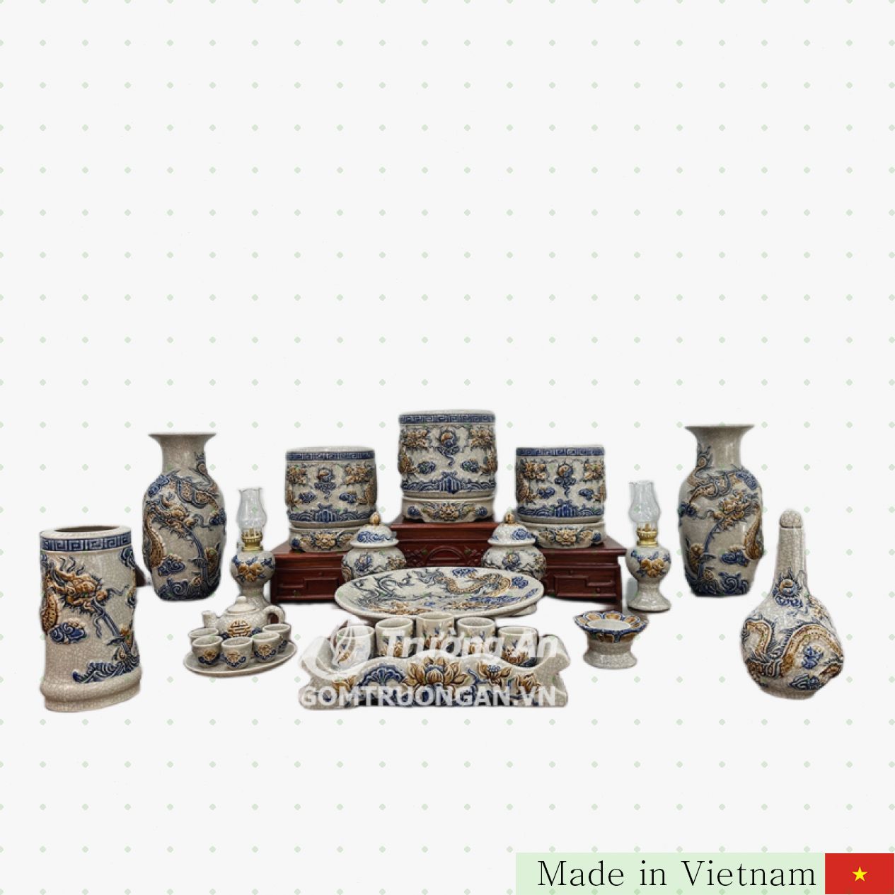저희가 소개하는 이 18종 구성의 바트랑(Bát Tràng) 도자기 제사 세트는 고품격 전통과 현대적 감각이 완벽하게 조화를 이룬 명품입니다. 수작업으로 완성된 금이 간 듯한 무광 유약의 독특한 질감과 아름다운 용과 연꽃 문양은 어떤 제단을 더욱 신성하고 고급스럽게 만들어 줍니다.