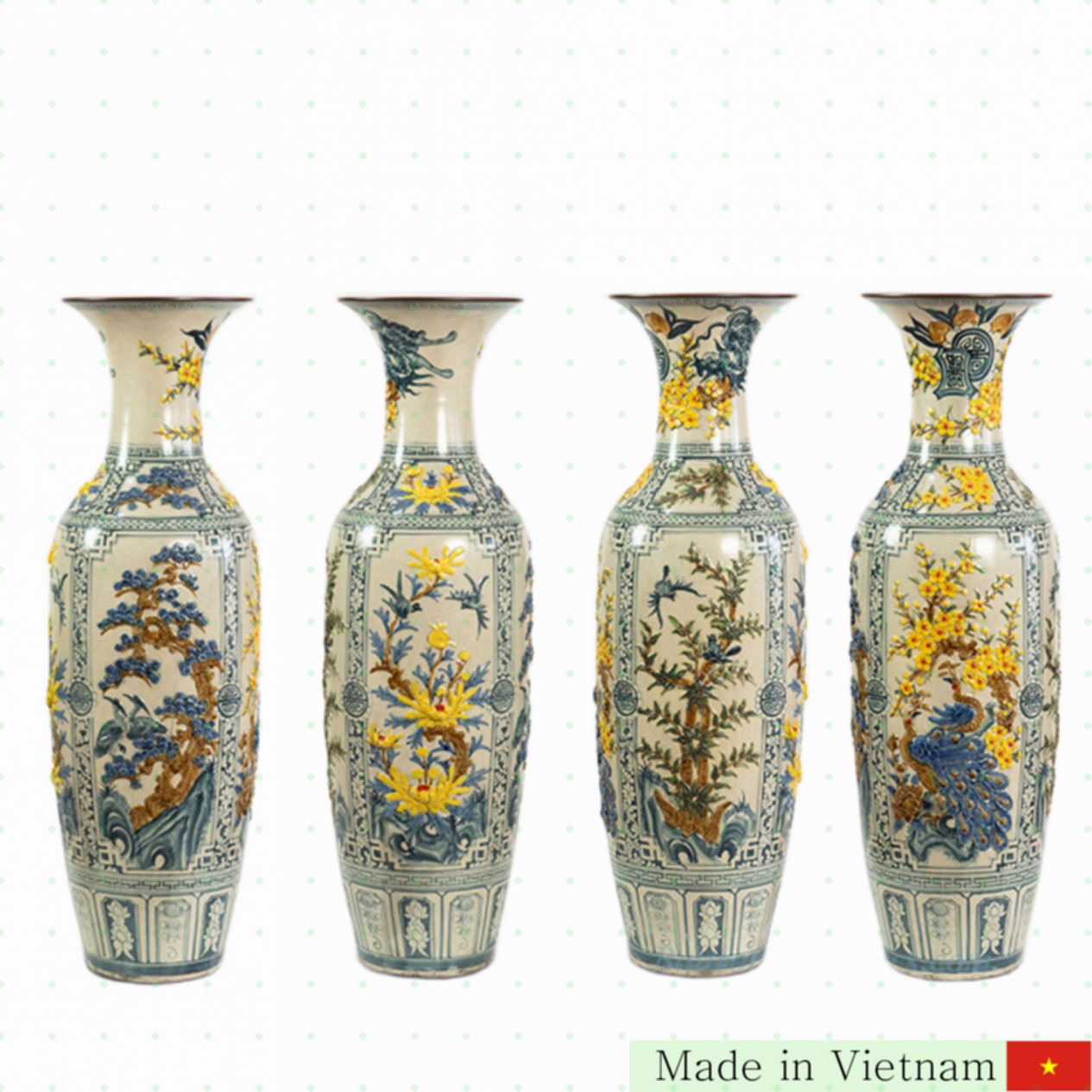 Bát Tràng의 정교한 수작업으로 완성된 1.6m 대형 사계절 사자병을 소개합니다. 이 제품은 사계절의 아름다움을 고스란히 담아내어 집안 분위기를 한층 고급스럽게 만들어 줍니다. 풍부한 디테일과 세련된 디자인으로 평범한 공간도 특별하게 연출할 수 있어 인테리어 필수 아이템입니다. 🌸🍂❄️☀️