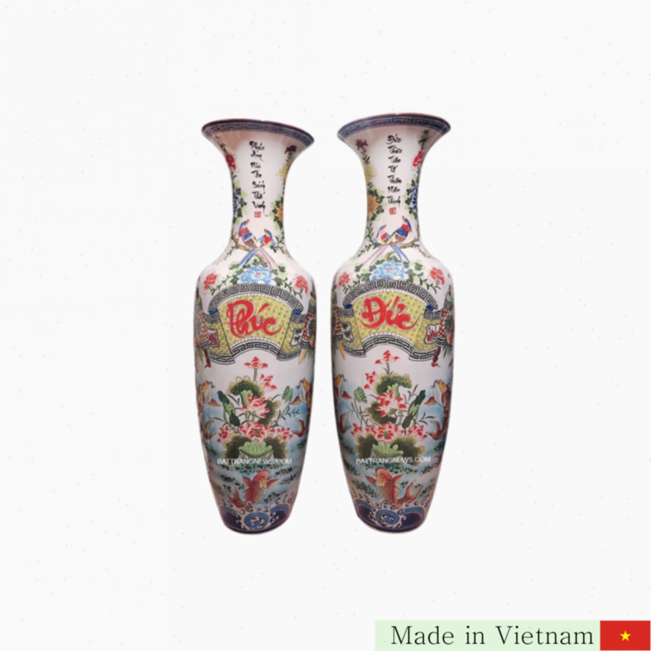 Lộc bình men màu Đức Phúc는 전통적인 붓터치 기법을 사용해 세밀한 그림을 담았습니다. 붉은색, 노란색, 흰색, 초록색, 파란색 등 오방색을 대표하는 다채로운 색채는 풍수에서 길운을 상징하며 시선을 사로잡는 조화로운 미를 선사합니다. 중앙에는 ‘Đức Phúc’라는 캘리그래피가 황금빛 배경 위에 붉은 글씨로 새겨져 있어 고귀하고 엄숙한 느낌을 줍니다.