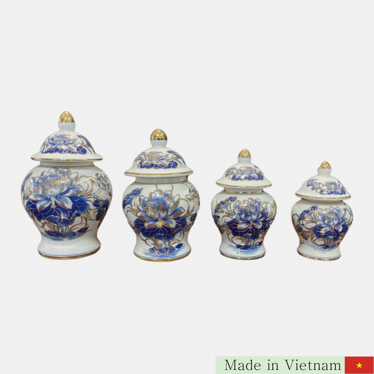 저희는 전통과 현대가 만나는 아름다운 [b]바트장(Bát Tràng) 제조사의 황금 그려진 단지[/b]를 소개합니다. 이 초에 놓는 단지는 소중한 제사 공간에 고귀함과 품격을 더해줍니다. 100% [b]백색 도자기와 황금 무늬[/b]가 어우러져 매 순간 신성한 분위기를 연출합니다.