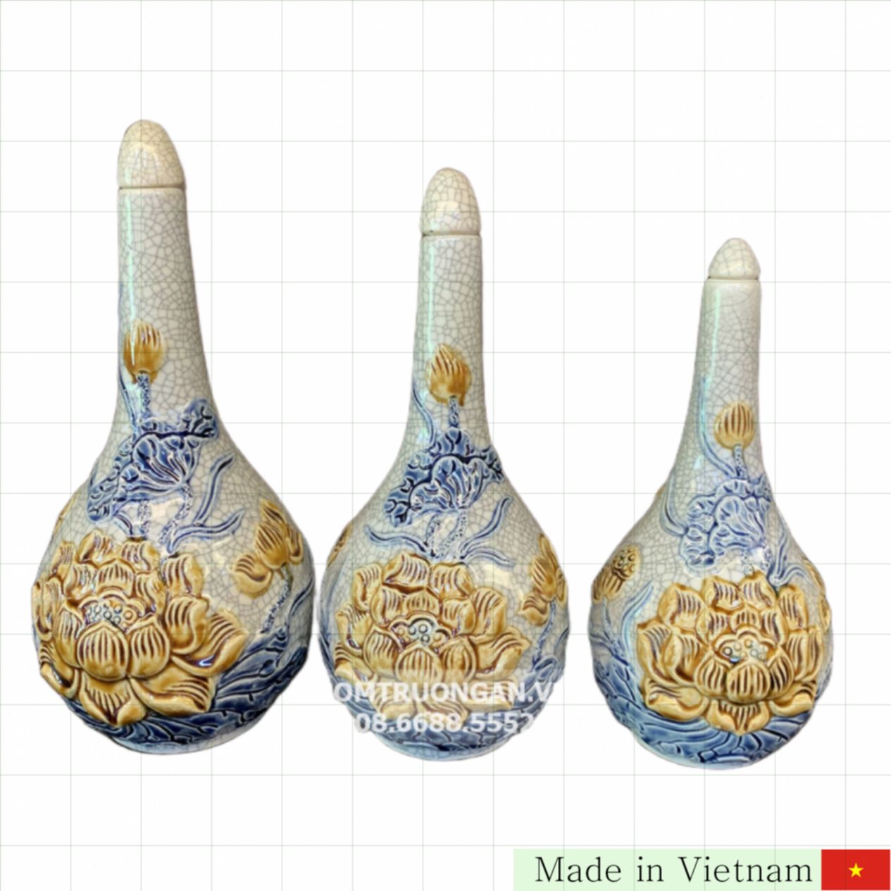 이 제품은 전통과 현대의 아름다움을 완벽하게 조화시킨 트ường Xuân S3 고급 연꽃 문양 주병입니다. 베트남 도자기 명산지인 Bát Tràng에서 제작된 이 주병은 최고급 도자기와 특수 크랙 유약으로 만들어져 고급스러우면서도 견고한 품질을 자랑합니다. 집안의 제례 공간, 특히 1m부터 1m75까지 다양한 크기의 제단에 이상적으로 어울리는 제품입니다.