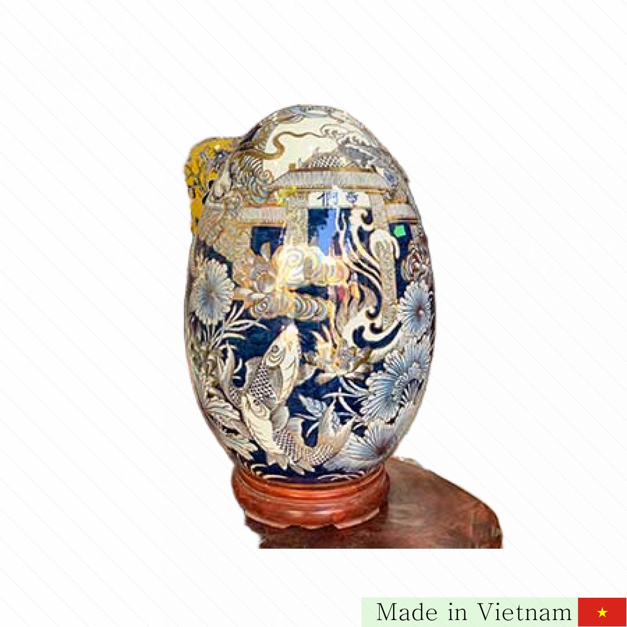 트렌디한 인테리어와 풍수에 탁월한 효과를 선사하는 황금 24K 도금 물고기 용 변신 계란(h50)을 소개합니다. 저희는 최고급 바트짱 도자기로 만든 이 작품을 자랑스럽게 선보이며, 집안이나 사무실 분위기를 고급스럽고 신비롭게 만들어 드립니다.