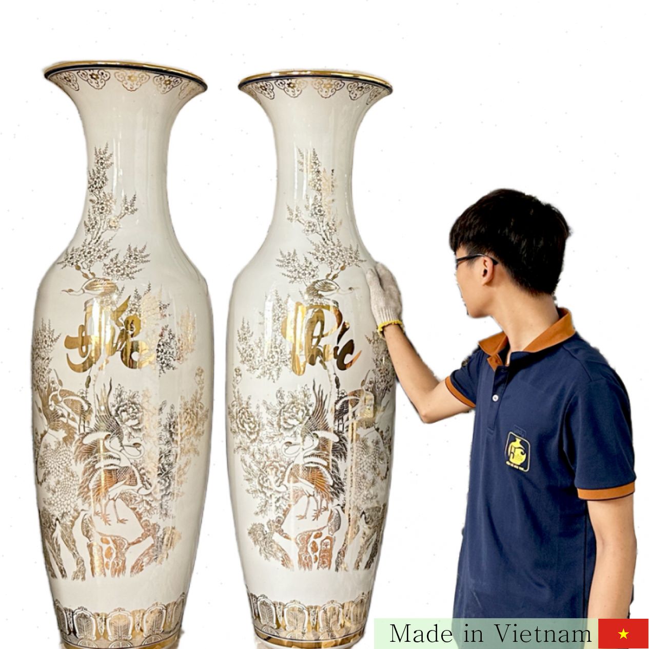 이 1.4미터 크기의 장식용 도자기 꽃병은 전통 도자기의 깊은 멋과 현대적인 아름다움이 완벽하게 조화된 작품입니다. 베트남 바트짱(Bát Tràng)에서 정교하게 제작되었으며, 24K 금으로 정성스럽게 그려진 금장 문양이 남다른 고급스러움을 자랑합니다.
