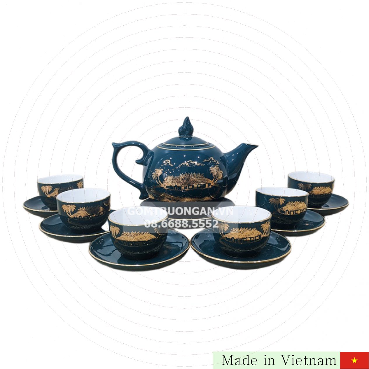세련된 청자 색상과 18K 골드로 섬세하게 그려진 전통 목가적 무늬가 돋보이는 Bát Tràng 청자 다기 세트, 목향강입니다. 집안 분위기를 한층 고급스럽고 편안하게 만들어, 차를 마시는 모든 순간을 특별하게 완성해 줍니다. 아름다운 디자인과 뛰어난 품질이 결합되어 선물용으로도 매우 인기입니다.