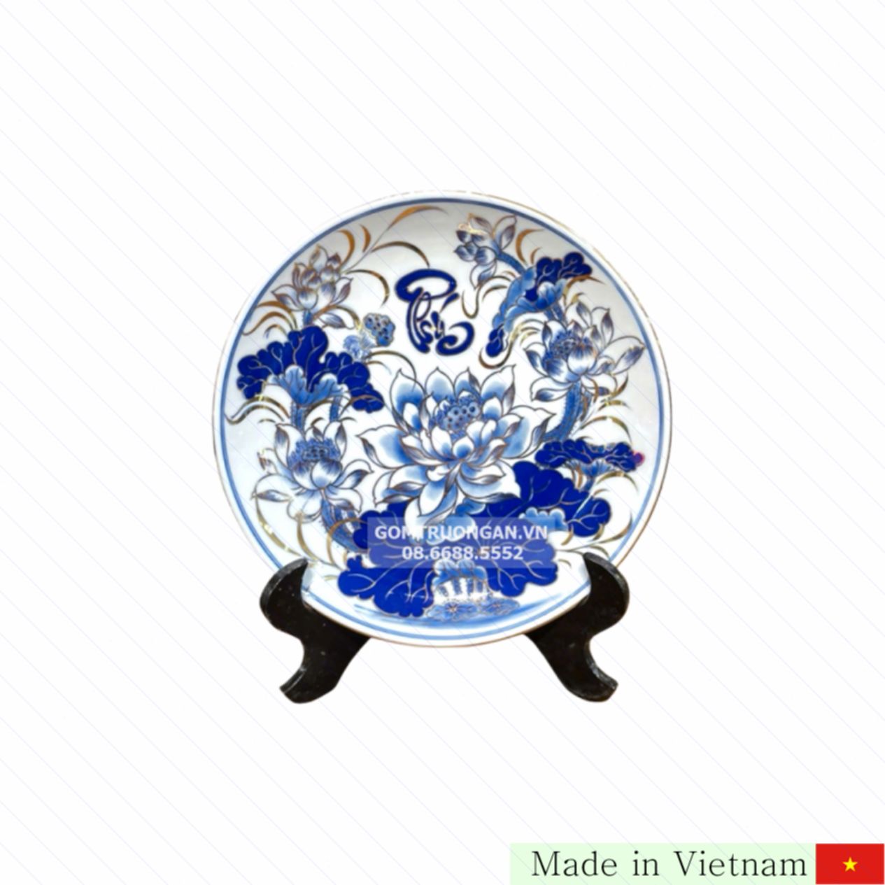 이 접시는 바트짱 도자기 장인이 정성껏 만든 고급 백자에 파란색 유약과 금박으로 섬세하게 그려진 연꽃 무늬가 특징입니다. 25cm 지름과 6.5cm 높이의 적절한 크기로 과일이나 제사용품을 올려놓기에 적당하며, 하나의 접시와 받침대로 구성되어 있습니다. 화려하면서도 전통미가 살아있는 디자인은 모든 기념일과 의식에 품격을 더해 줍니다.