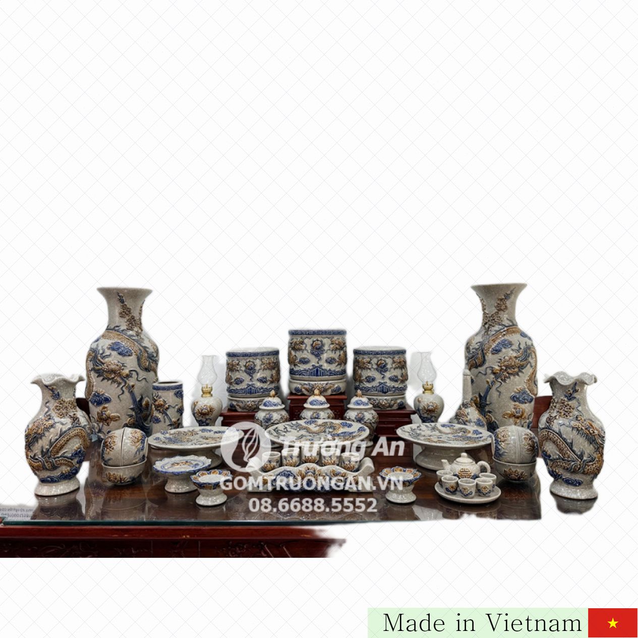 이 세트는 반트랑 전통 도자기 장인의 손길로 완성된 고운 균열 무늬의 자기 질감이 특징입니다. 50cm 높이의 대형 록병 2개와 30cm 중형 록병 2개, 3개의 향단과 향받침, 그리고 17cm 고치, 5구 찻잔 기, 3개의 차반, S2 술병 1개, S1 향통 1개, 유등 2개, 촛대 2개, 5잔 찻잔 세트 그리고 6개의 공양 그릇과 1개의 트라우 꽈 접시까지 포함되어 있습니다.