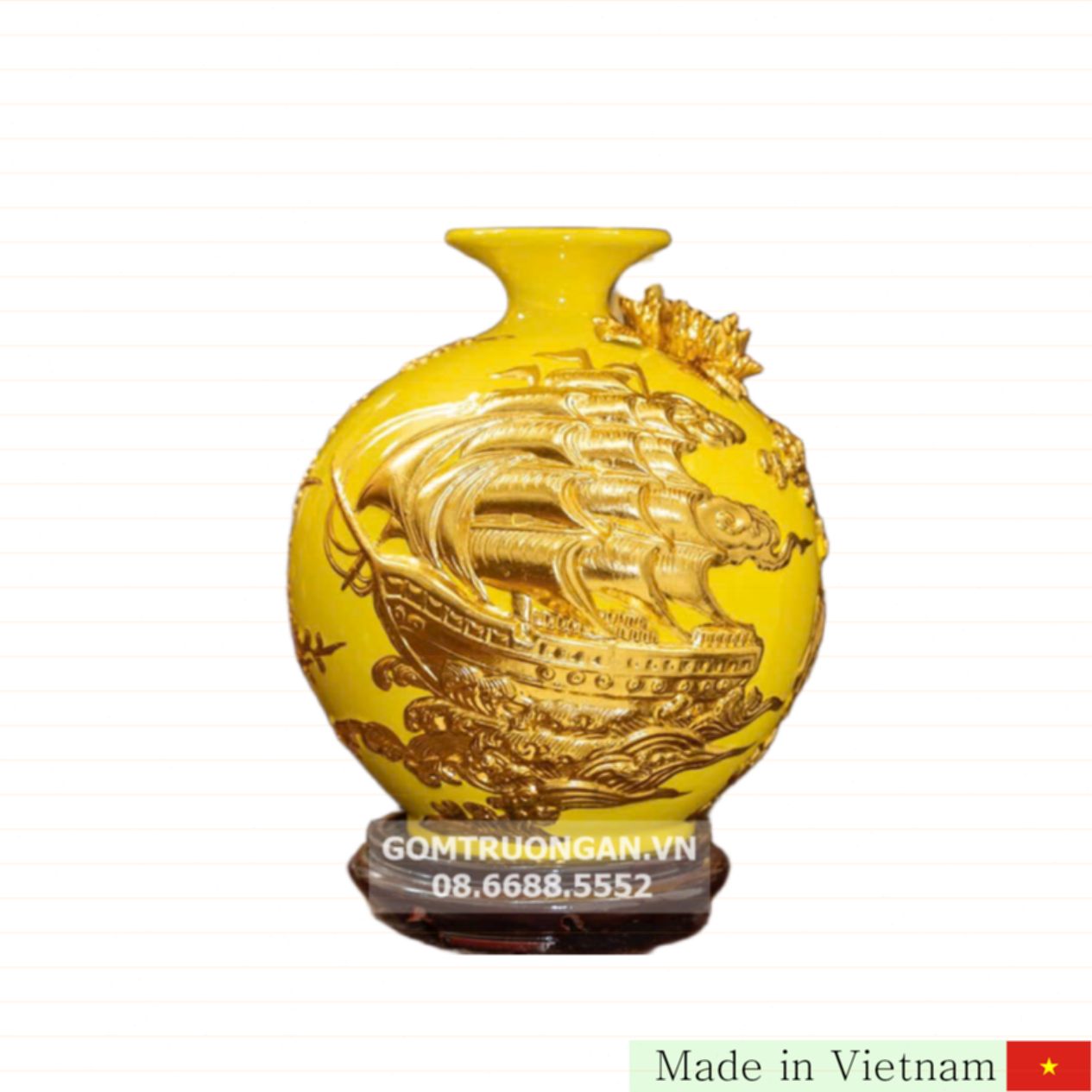 이 아름다운 30cm 크기의 풍수 도자기 병은 재물을 끌어들이는 최고의 아이템입니다. 전통 바트쨩(Bát Tràng) 도자기 공예와 황금 도금 장식이 만나 고풍스럽고 세련된 멋을 자아냅니다. “탕부엉 쉬오이죠이(Thuận Buồm Xuôi Gió)"라는 행운의 그림으로 장식되어 집안이나 사무실 어디에 놓아도 긍정적인 에너지를 가득 채워줍니다.