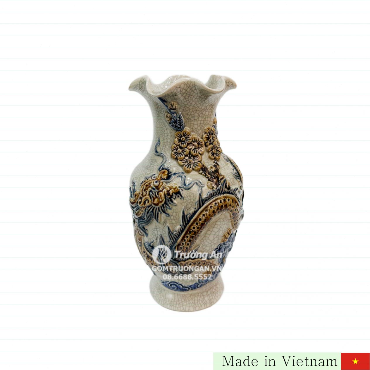 제사상과 전통 공간을 한층 돋보이게 하는 이 30cm 높이의 화병은 정통 바트짱(Bát Tràng) 도자기 장인이 만든 최고의 작품입니다. 고급스러운 미려함을 자아내는 미운련(미뢰연) 기법으로 매끄럽고 특별한 질감이 돋보입니다. 독특한 용 무늬가 고귀한 분위기를 더해 고전과 현대의 조화를 완벽히 이룹니다.