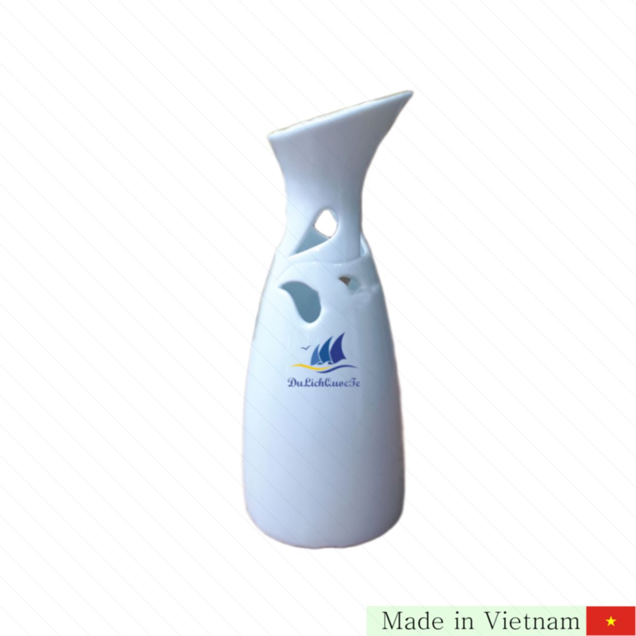 이 화병은 전통과 현대가 조화를 이루는 바트짱(Bát Tràng) 명품 도자기로, 고급스러운 화이트 유약이 입혀져 있어 어느 공간이든 세련되게 연출합니다. 독특한 병 모양 디자인과 옆으로 약간 기울어진 입구는 기존의 전통적 직선형 화병과 달리 자연스러운 곡선을 살려 부드러운 느낌을 줍니다. 목 부분에는 섬세한 잎사귀 문양이 뚫려 있어 미적 감각을 더했습니다.