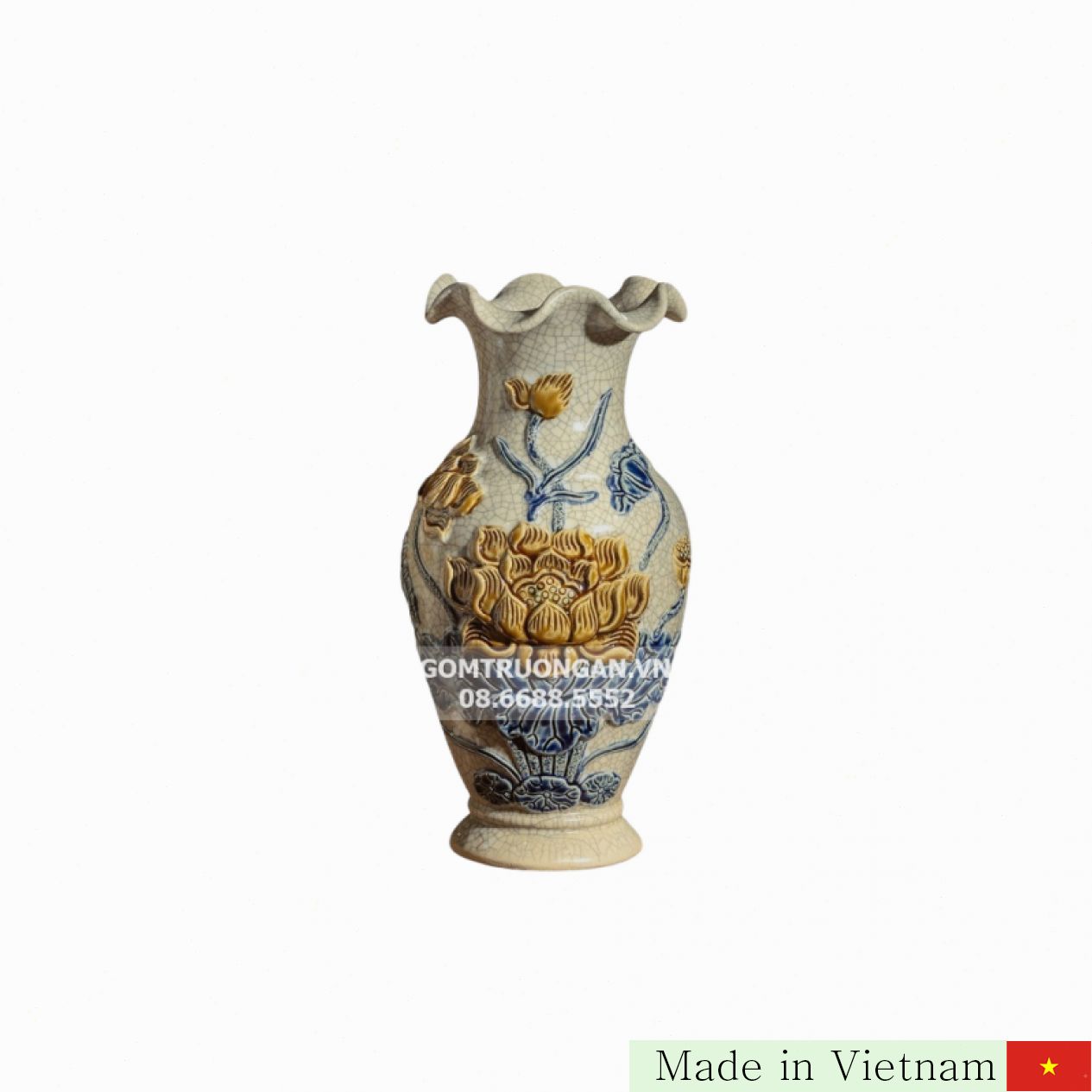 이 화병은 제사용 화병으로 제작되어 정갈하고 고결한 느낌을 줍니다. 고급 란조리(연꽃 문양)의 부조가 돋보이는 수공예 고급 천연 요철 유약으로 마감했으며, 크기는 높이 32cm로 적당하여 다양한 공간에 잘 어울립니다. 입구는 부드러운 물결 모양으로 디자인되어 세련된 멋을 자아냅니다.