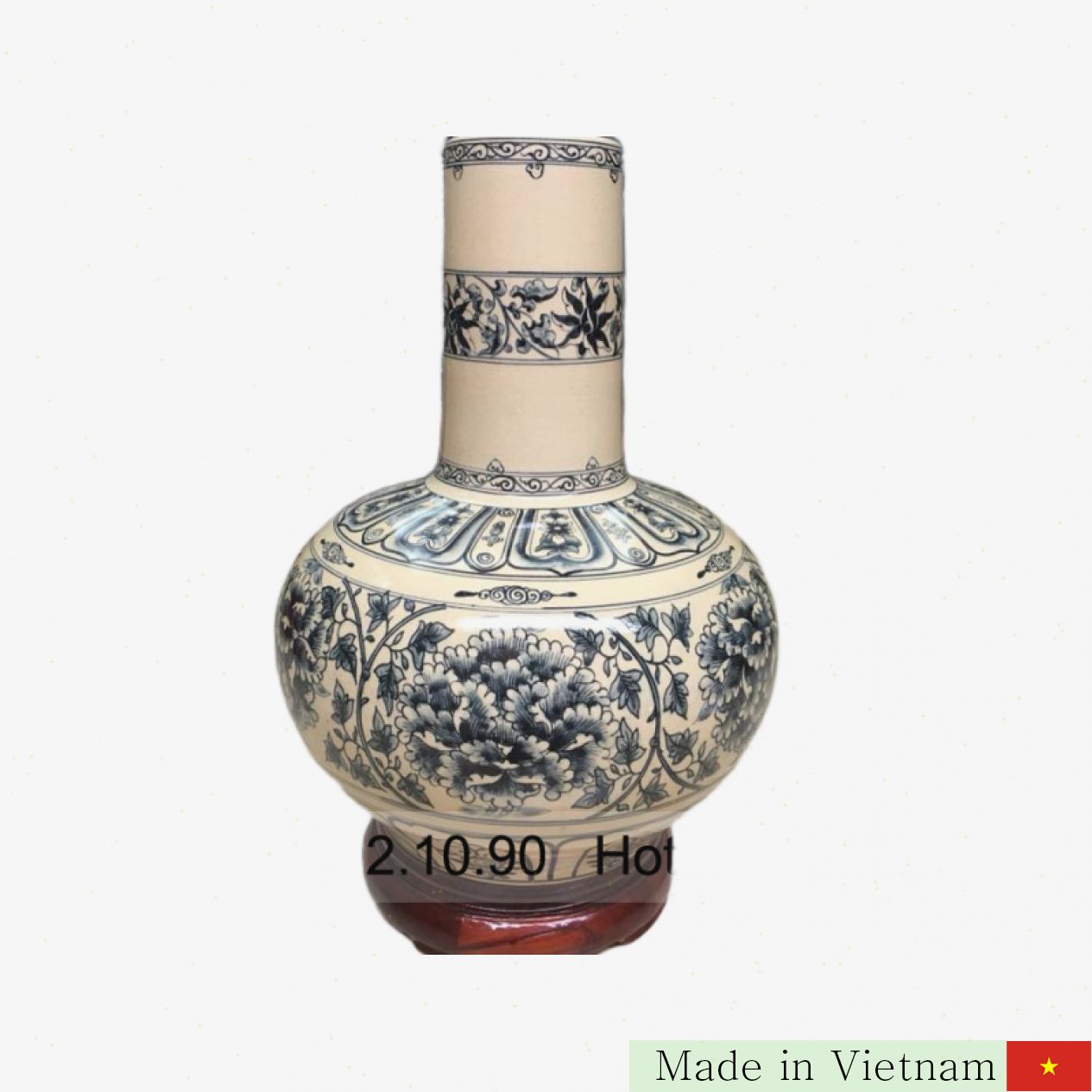 우리는 전통과 현대가 어우러진 명품 도자기를 소개합니다. 이 청자병은 바트짱(Bát Tràng) 도자기의 우수한 장인정신이 돋보이는 작품입니다. 황금 균열(금분) 유약이 우아하게 빛나며, 디자인은 전통적인 꽃무늬와 섬세한 세공으로 고풍스러우면서도 세련된 분위기를 자아냅니다.