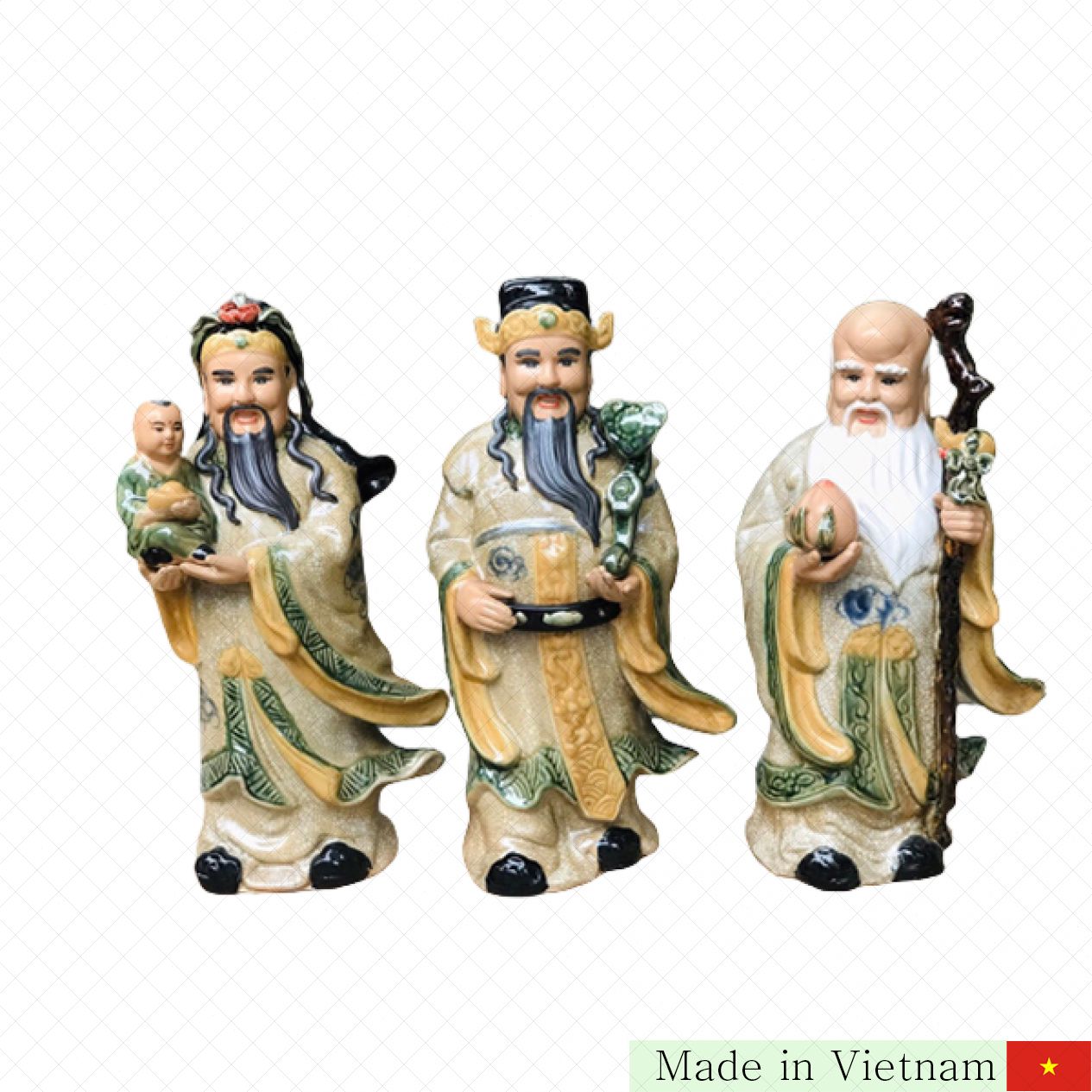 저희의 복록수 도자기상은 대한민국 전통의 아름다움과 풍요를 담아 Bát Tràng에서 선보이는 고품격 제품입니다. 45cm의 아담한 크기로 다양한 공간에 쉽게 배치할 수 있어 집안 곳곳에 행운과 복을 불어넣습니다. 섬세한 손기술로 빚어진 이 도자기는 고대의 멋을 살린 균열 무늬 유약이 전체를 감싸, 고급스러움과 세련됨이 돋보입니다.