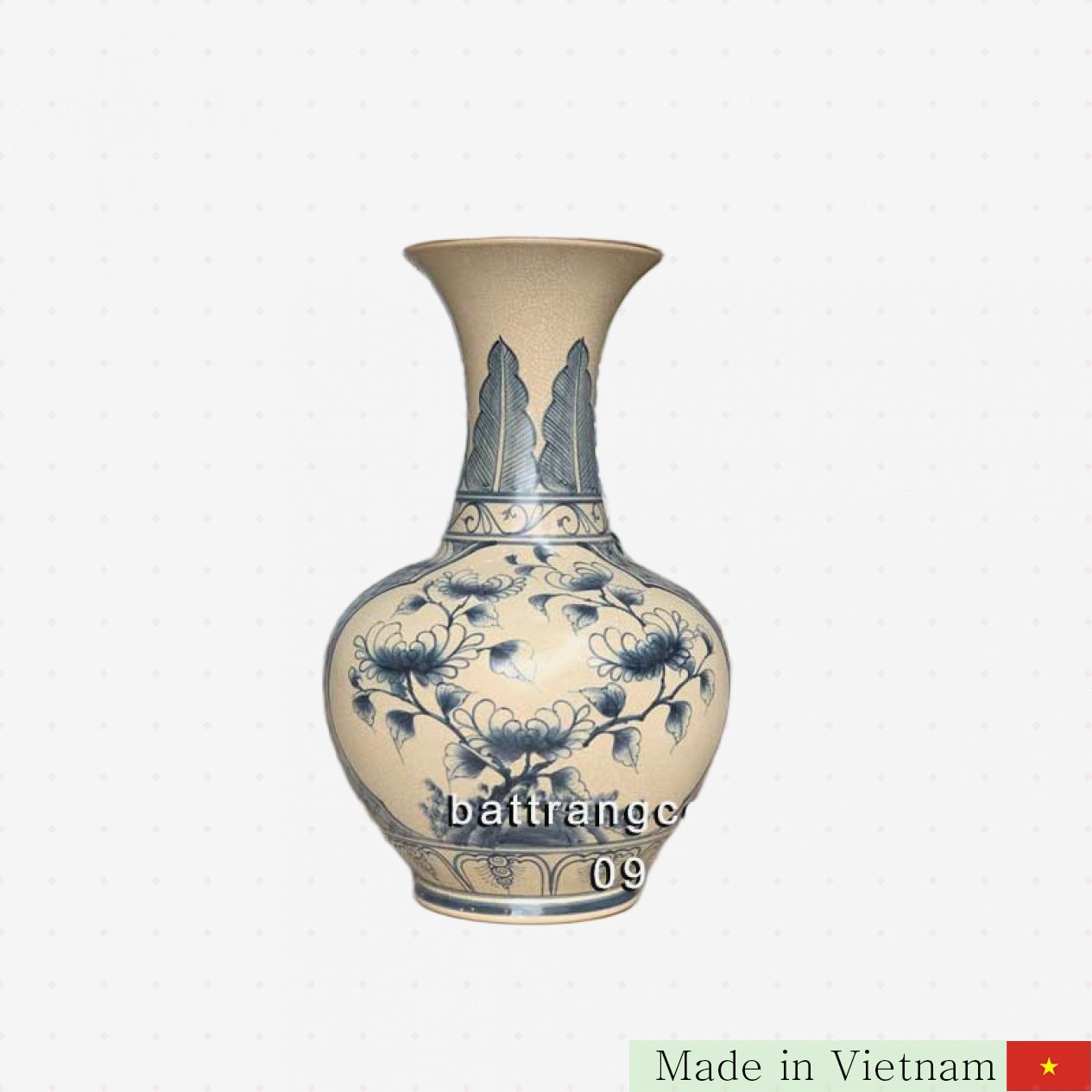 이 도자기 마늘병은 전통적인 바트짱(바트쨩) 도예 기법으로 제작되었으며, 높이 45cm, 배 부분 지름 26cm의 완벽한 크기를 자랑합니다. 아름다운 균열 무늬(멍란)와 세밀하게 그려진 '이경' 문양이 조화를 이루어 고풍스러운 분위기를 연출합니다. 실내 인테리어뿐만 아니라 명절 꽃꽂이용 꽃병으로도 최적입니다.