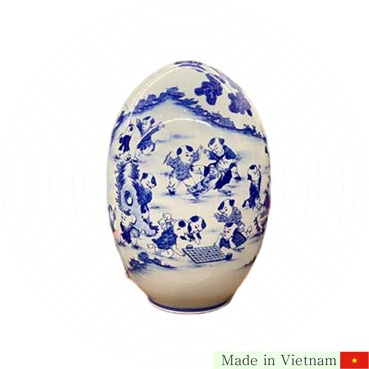 배경으로 펼쳐진 베트남 전통 시골 마을 풍경은 가족의 화목과 평화로움을 상징합니다. 이 아름다운 도자기 달걀 한 점은 집 안에 따뜻한 정과 행운을 불러올 완벽한 인테리어 아이템입니다.