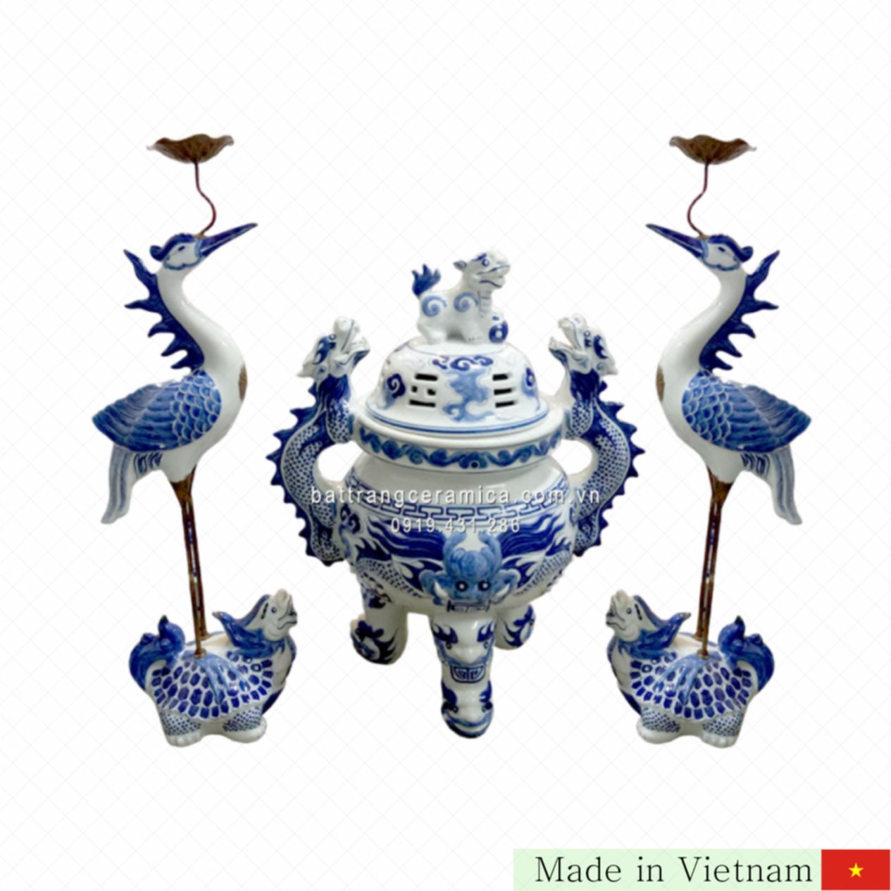 전통과 품격이 어우러진 남색 유약 청자 향로 세트(일명 삼신 세트)입니다. 이 아름다운 3종 세트는 1개의 향로(정)와 2개의 촛대(등)로 구성되어 있습니다. 향로는 베트남 전통 문화에서 가정, 사원, 추모 공간 등 다양한 신성한 장소에서 향을 피우는 데 사용되는 매우 중요한 제구입니다.