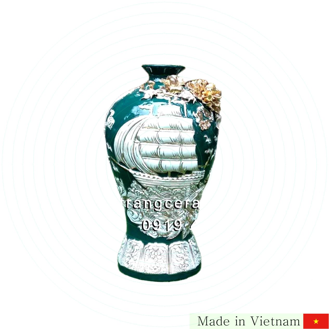 마이 병 적록 순풍 순조 금칠 도자기, 52cm의 옥색 빛깔로 고급 도자기 소재에 정교한 금칠 장식이 더해진 이 작품은 뛰어난 미적 가치뿐 아니라 풍부한 재물과 행운을 상징합니다. 순풍에 돛단배가 힘차게 나아가듯, 이 마이 병은 집안과 사업에 무한한 번영과 평안을 가져다 주는 상징입니다.