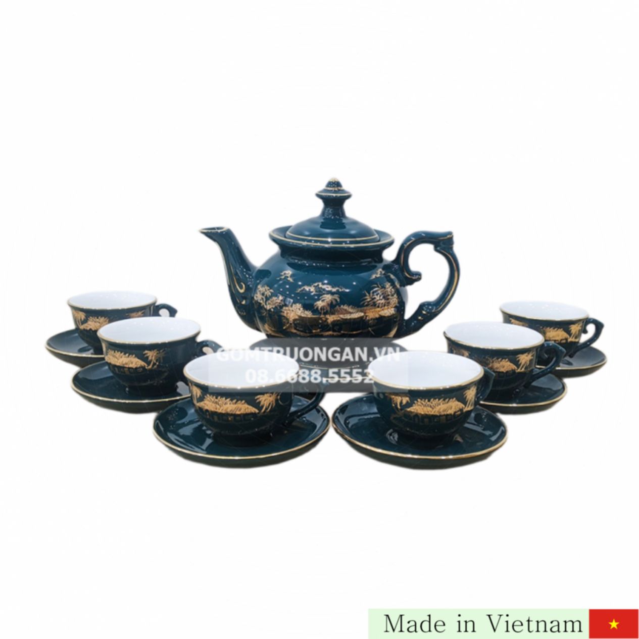 저희가 선보이는 바트짱 청록빛 가마구이 다기 세트는 전통과 현대가 어우러진 최고의 예술품입니다. 고급 바트짱 도자기로 만든 14피스 구성, 550ml 용량의 주전자와 6개의 다기잔, 그리고 7개의 접시로 완성되었습니다. 각 제품은 청록색 빛깔에 18K 황금으로 정교하게 그려진 농가풍 무늬가 더해져 품격과 고급스러움을 더욱 빛냅니다. 이 특별한 다기 세트는 집안의 차 문화 공간을 더욱 우아하고 풍성하게 만들어 줍니다. 🍵🌿