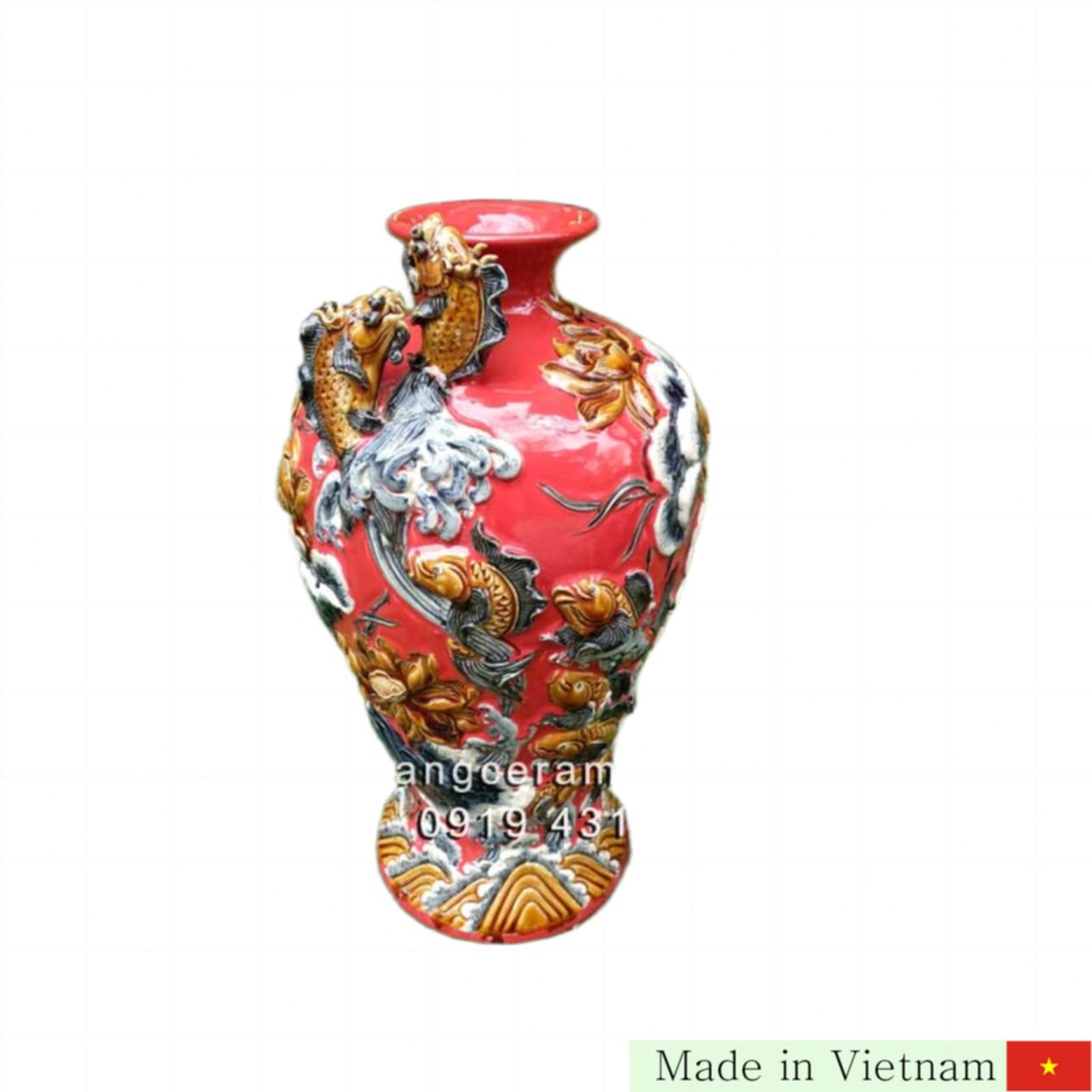 고급 바트짱(Bát Tràng) 도자기로 만든 마이 병 적색 잉어 용 변신은 높이 55cm로, 섬세한 수공예와 화려한 색감이 어우러진 완벽한 장식품입니다. 특히, 적색은 화(火)와 토(土)의 기운을 가진 분들에게 큰 행운을 불러오는 컬러로 사랑받고 있습니다.
