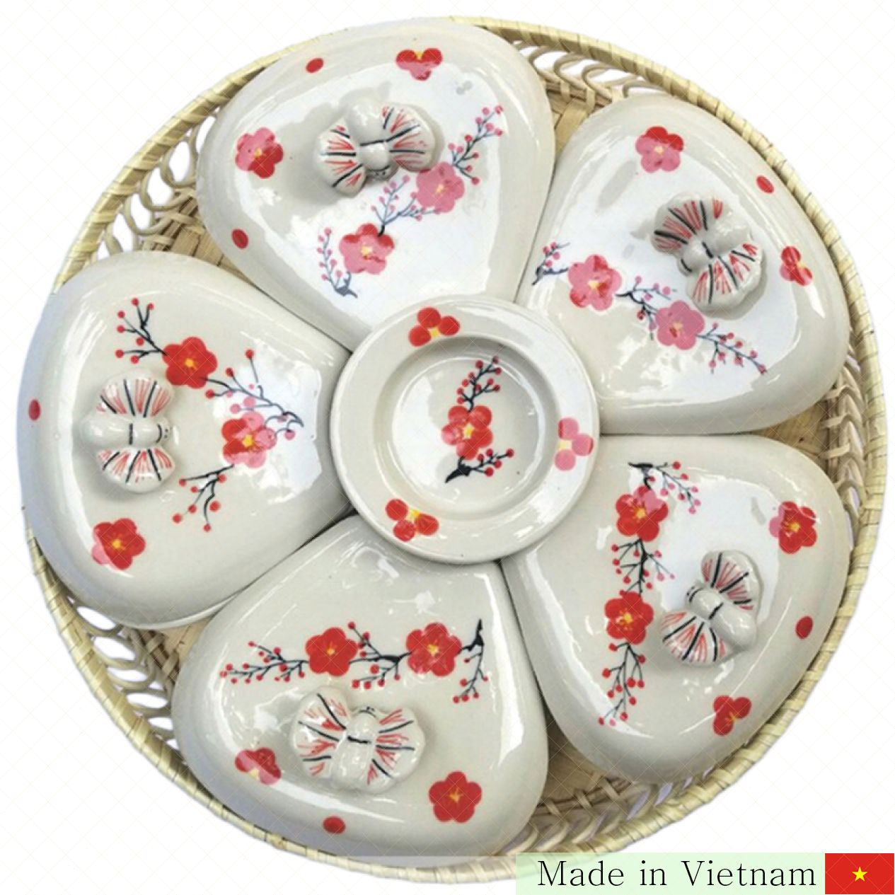 고급스러운 매화꽃 오브제가 돋보이는 5각 꽃잎 디테일의 도자기 쟁반 세트를 소개합니다. 이 세련된 세트는 전통 바트짱 도자기의 예술적 정수를 담아내어 집안 분위기를 한층 높여줍니다.