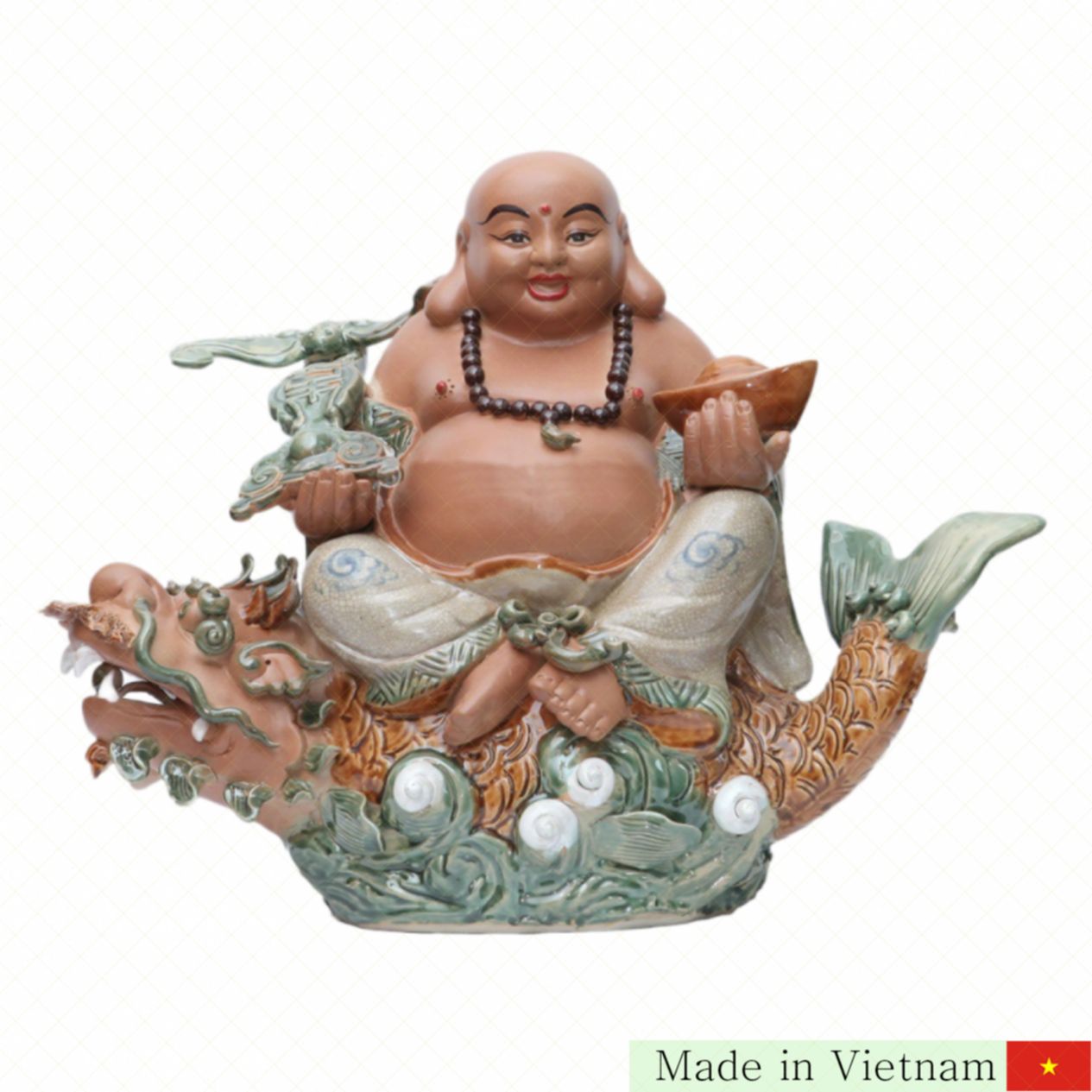 이 작품은 디락(웃는 부처)이 힘차게 변신하는 잉어(카펠) 위에 앉아 있어, 풍수적으로 큰 행운과 성공을 상징합니다. 동양신화 속 용은 권력과 긍정 에너지를 의미하며, 부처님의 발 아래 있어 지혜와 깨달음이 주는 삶의 안정을 뜻합니다.