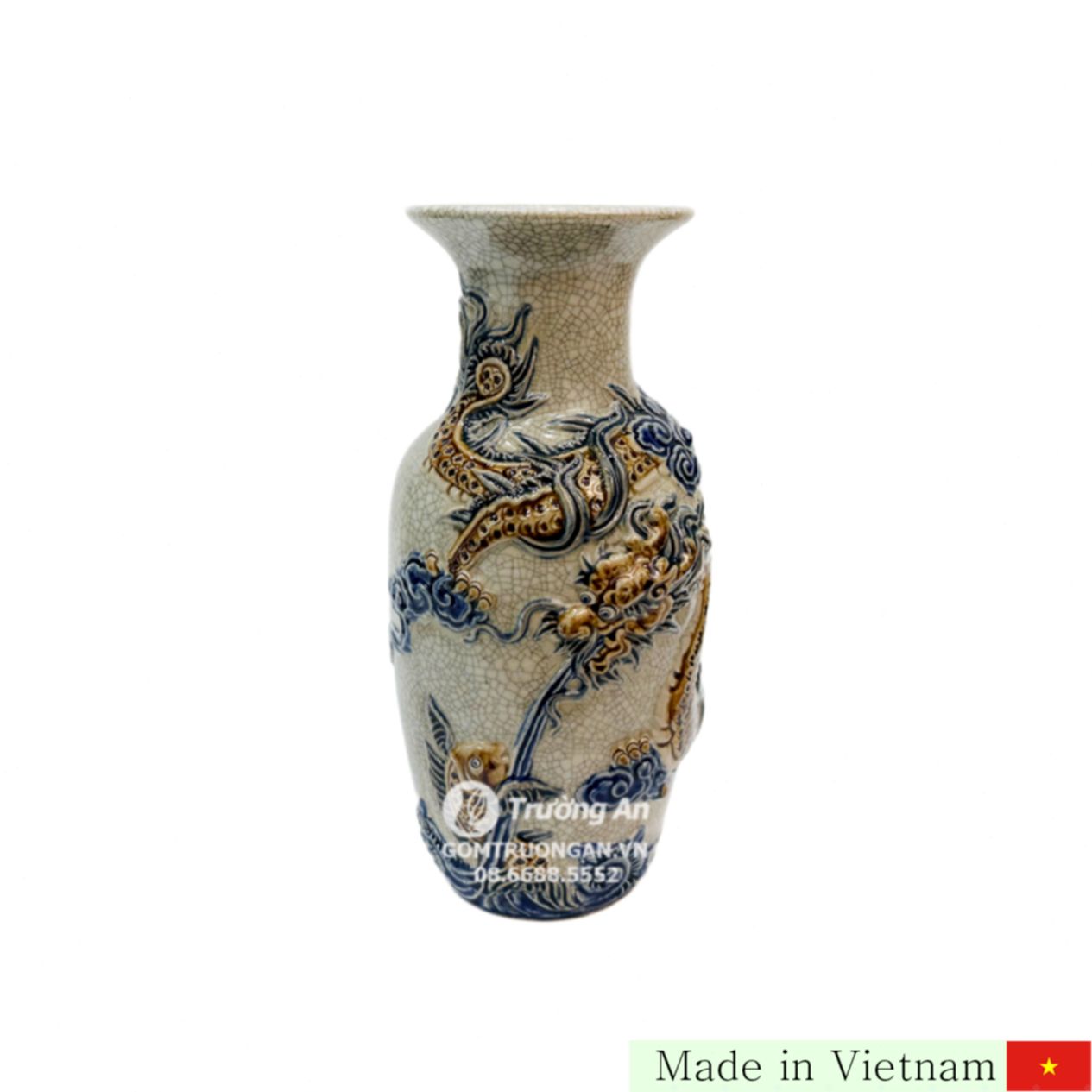 저희가 소개하는 이 제품은 베트남 바트짱(Bát Tràng) 장인이 제작한 60cm 높이의 로터리 크랙 글레이즈 세라믹 꽃병입니다. 고급스러운 용 모양 문양과 독특한 크랙 무늬가 조화를 이루어 전통미와 현대미를 동시에 느낄 수 있습니다. 세밀한 수공예로 완성되어 집안이나 예배 공간에 품격을 더하는 완벽한 아이템입니다.