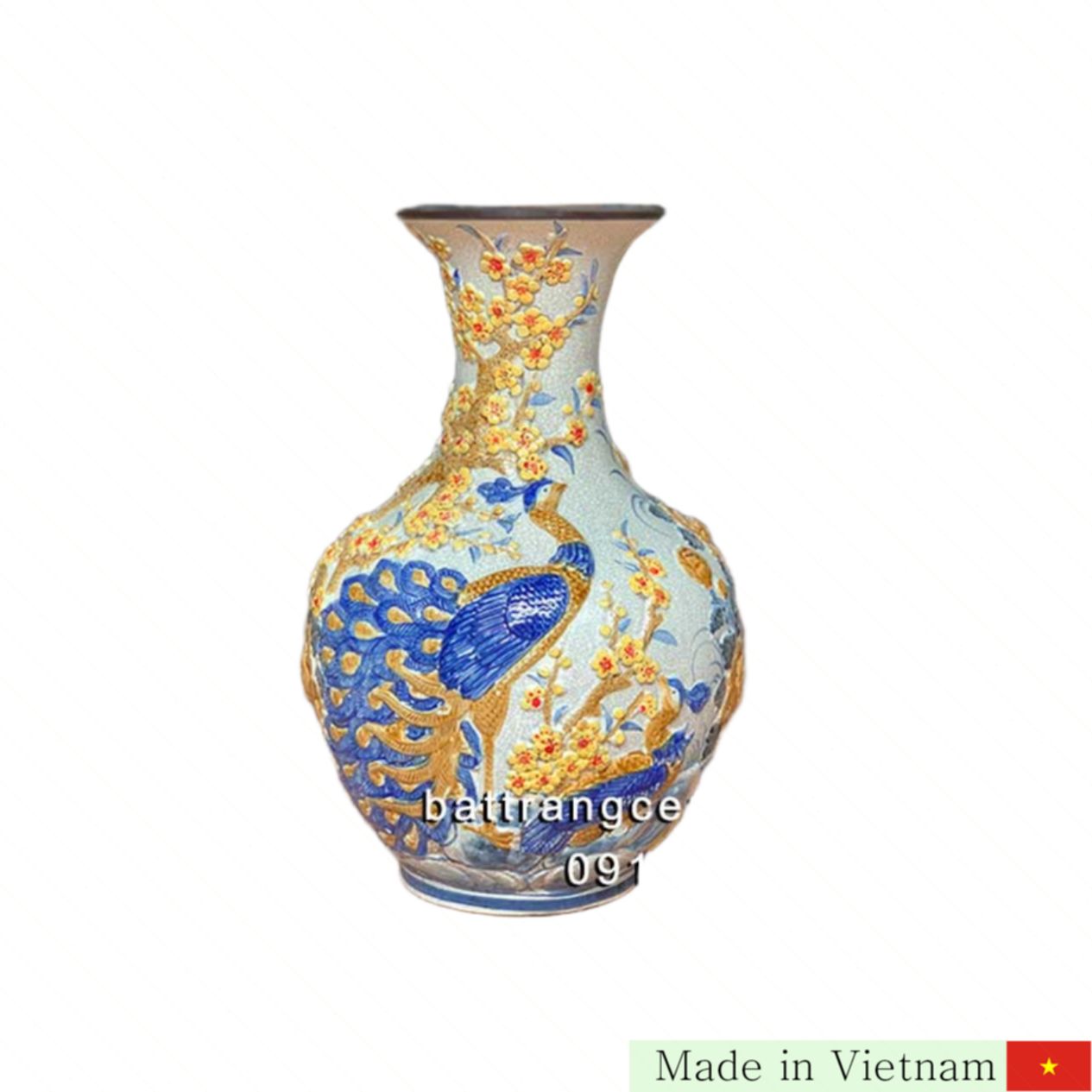 이 도자기 화병은 섬세한 수작업으로 공작새와 매화 무늬가 입체적으로 표현되어 있어 예술적 가치를 더했습니다. 65cm의 우아한 크기는 집안 어디든 눈길을 사로잡기에 충분하며, 공간을 더욱 풍성하고 아름답게 만듭니다. 견고하고 고급스러운 바트짱 도자기의 질감과 마감은 오랫동안 변치 않는 명성을 자랑합니다.