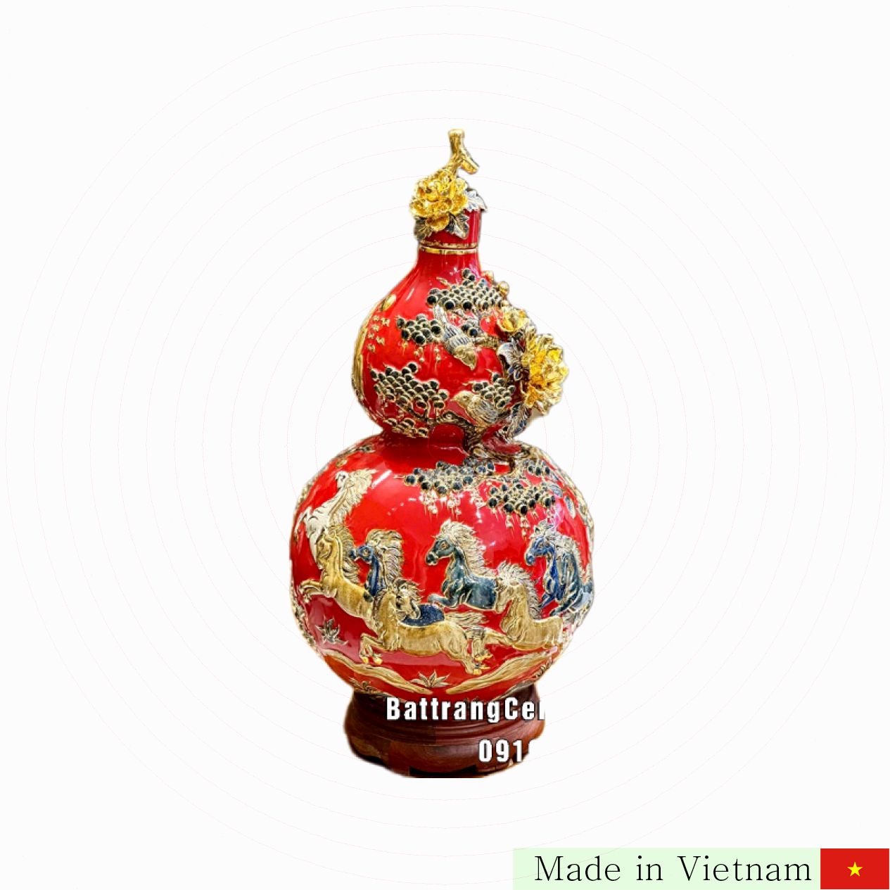 이 고급 호로는 전통 사기 세라믹에 붉은 유약을 바르고 정교한 8마리 달리는 말 문양을 부조 처리했습니다. 특히 24K 금으로 세밀하게 칠한 디테일이 고급스러움을 극대화하며, 한 번 더 가마에 구워내어 내구성과 광택이 더욱 뛰어납니다.