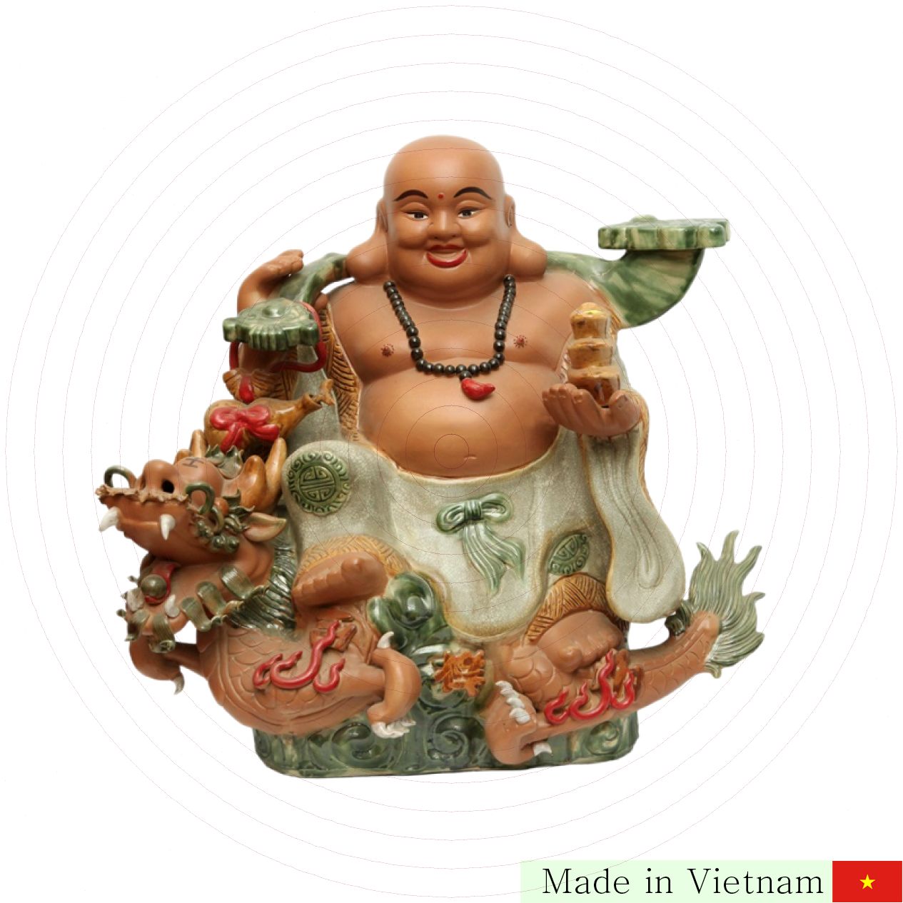 70cm 크기의 이 도자기 미륵상은 고급스러운 균열 유약으로 만들어졌으며, 용 위에 앉은 웅장한 모습이 인상적입니다. 바트랑(Bát Tràng) 장인의 정교한 수작업으로 완성되어 어떤 공간에서도 빛나는 존재감을 자랑합니다.