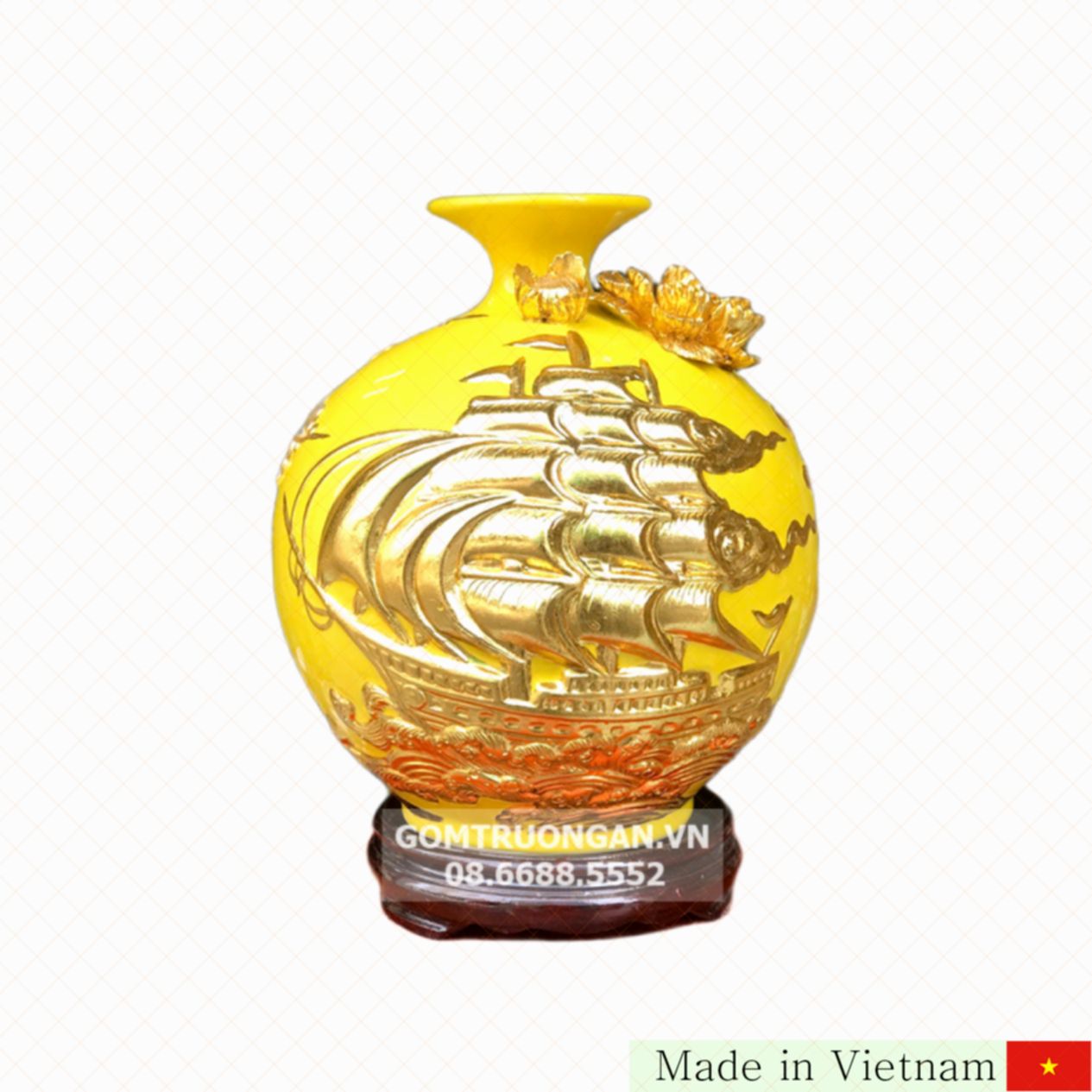 저희가 선보이는 27cm 크기의 황금도금 풍수 재물운 병은 전통 바트짱 도자기로 정교하게 제작되었습니다. 이 제품은 “순조로운 항해(Thuận Buồm Xuôi Gió)”라는 뜻의 아름다운 풍수 테마를 담아 집안이나 사무실에 행운과 재물을 불러들입니다. 탁월한 장식 효과가 뛰어나 거실이나 책상 위 공간에 세련된 분위기를 연출합니다.