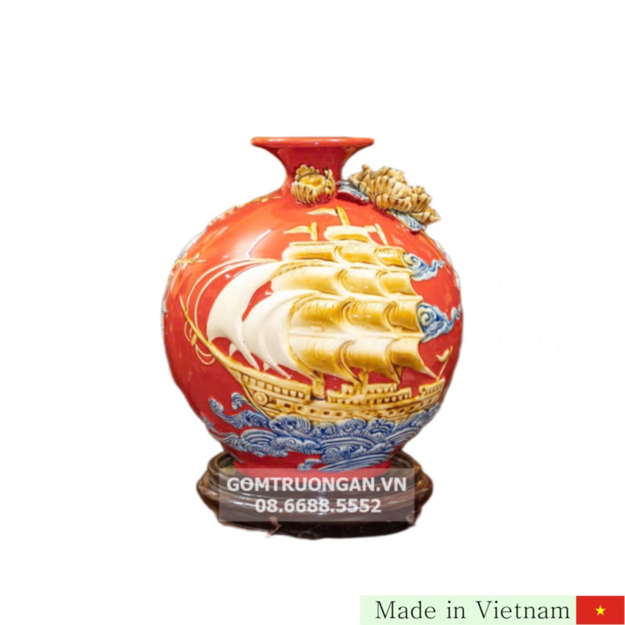 이 항아리는 베트남의 명성 높은 바트짱(Bát Tràng) 도예 브랜드에서 제작했으며, 전통적인 입체 부조 공법으로 섬세한 '순풍만리(Thuận Buồm Xuôi Gió)' 테마를 생동감 있게 표현했습니다. 풍수 인테리어에 이상적이며 거실이나 사무 공간에 행운과 번영을 불러옵니다. 또한 꽃이나 공작 깃털 등을 꽂아 꾸밀 수 있어 인테리어 소품으로도 완벽합니다.