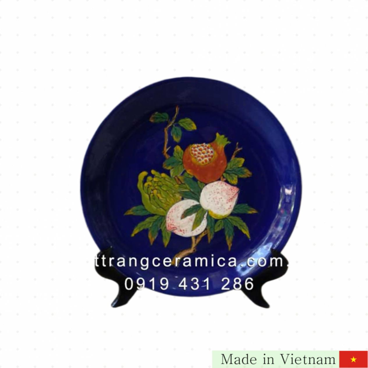 디아 칸 프럭 록 토 램 라지 35cm는 뛰어난 장식성과 깊은 풍수 의미를 지닌 최고의 도자기 제품입니다. 바트짱(Bát Tràng) 수공예 장인들이 제작한 이 제품은 복과 번영, 장수를 상징하는 부처손, 석류, 복숭아 세 가지 과일을 아름답게 조합해 가족과 공간에 행운을 더해줍니다. 섬세한 청색 유약과 독창적인 디자인으로 완성되어 어느 공간에 두어도 품격 있는 분위기를 선사합니다.