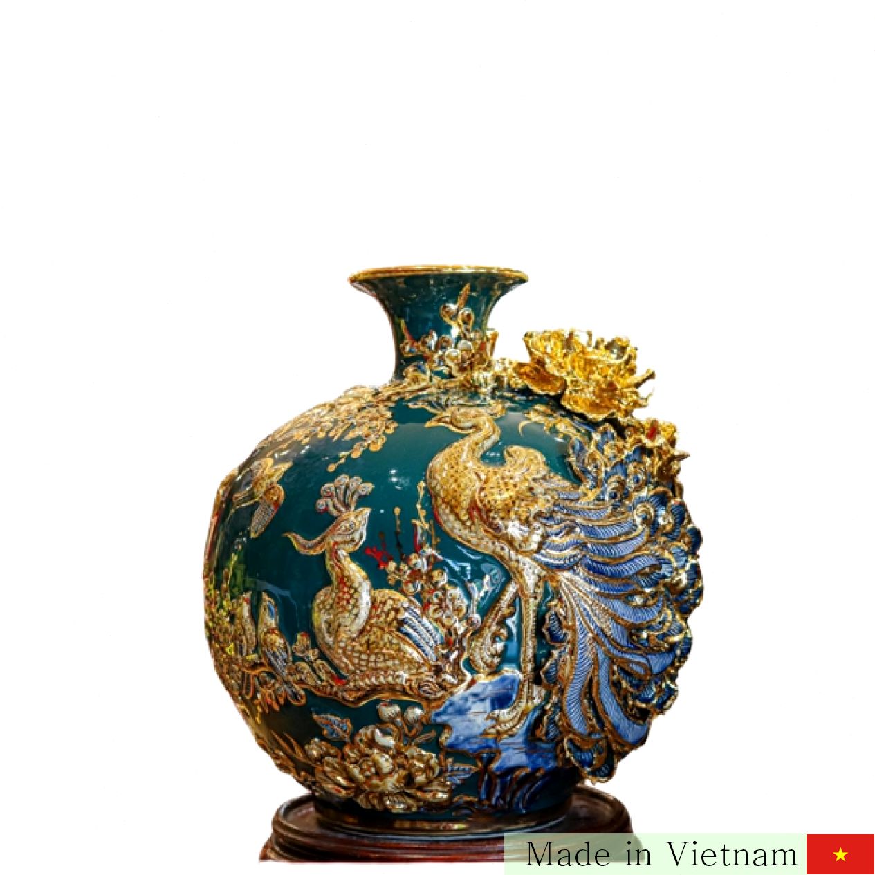 복록 연명 옥빛 청자 금화 무늬 바트랑 도자기는 베트남 전통 바트랑 도자기 장인이 정성을 다해 만든 최고급 수제품입니다. 이 작품은 부와 명예, 성공을 상징하며, 인테리어를 한층 고급스럽게 꾸며주는 장식용 도자기입니다.