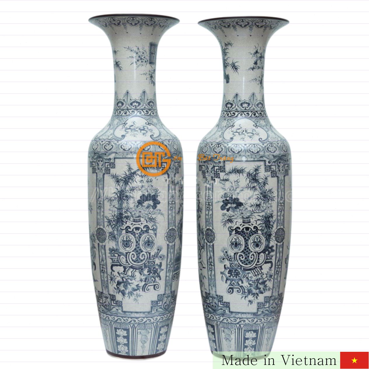 탁월한 장식과 깊은 뜻을 담은 고급 도자기, 고급 바트짱(Bát Tràng) 도자기 의 복 풍요 무늬 옹기 화병 세트입니다. 높이 1.55m에 달하는 이 고풍스러운 도자기 세트는 집안을 고급스럽고 운이 좋은 공간으로 만들며, 오래도록 그 빛을 잃지 않는 전통의 멋이 살아있습니다.