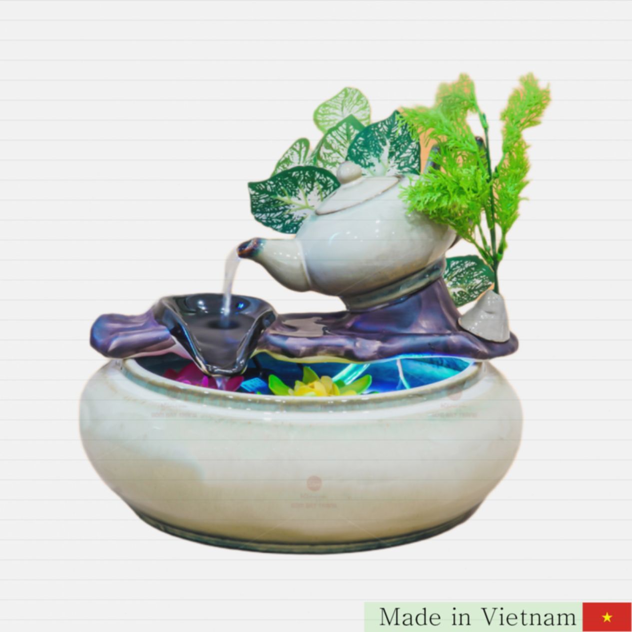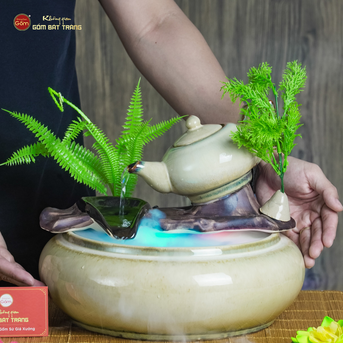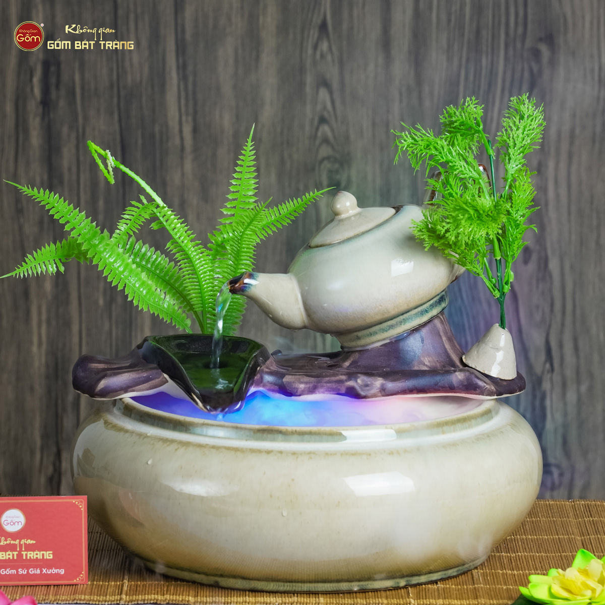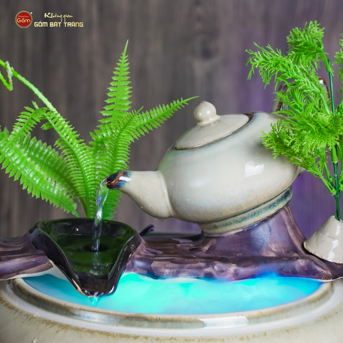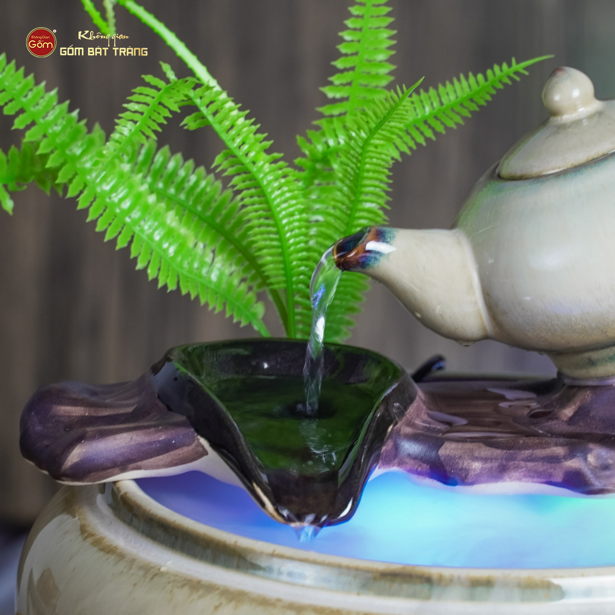 분수에서 흘러내리는 물은 계속해서 재물과 행운이 순환함을 상징합니다. 차 주전자는 마음을 안정시키고 평화를 가져다주는 이미지로, 집안에 긍정적인 기운을 가득 채워줍니다. 꽃과 잎 장식은 자연의 생명력을 담아 공간을 활기차고 풍성하게 만듭니다. 이런 이유로 거실, 업무 공간, 또는 명상 공간에 두기에 최적입니다.