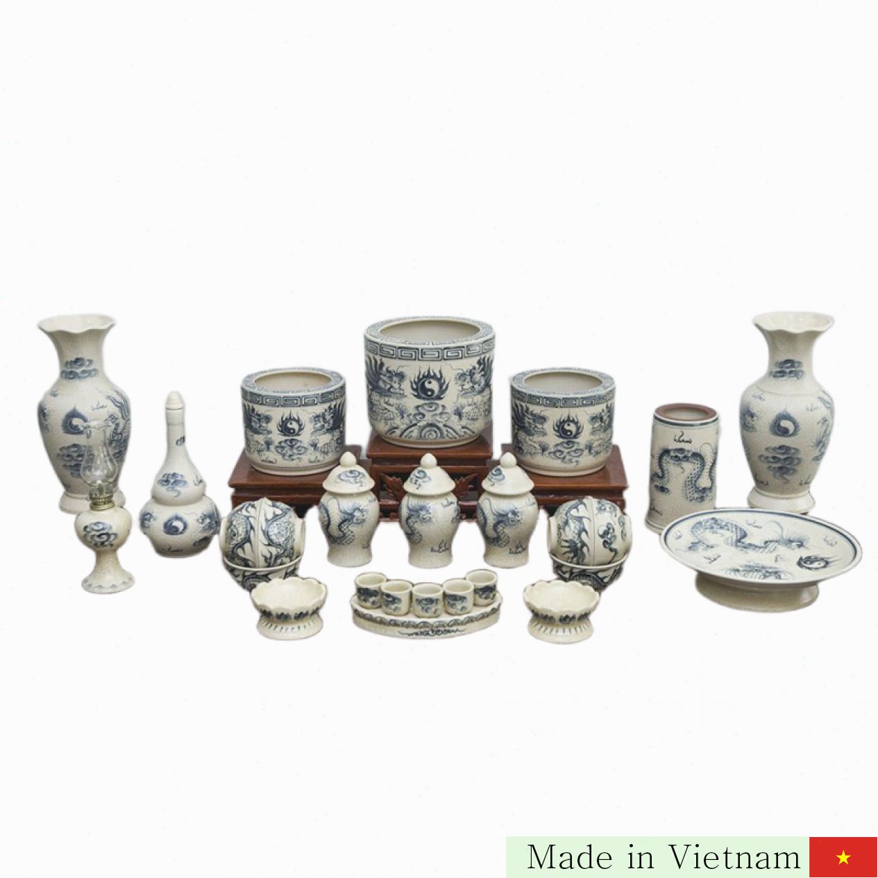 Bát Tràng의 전통과 예술이 만나 완성된 21세트 구성의 독특한 찬양용 도자기 세트입니다. 세련된 균열 무늬와 섬세한 용 그림이 고급스러운 분위기를 연출해 소중한 제단을 더욱 빛나게 합니다. 탁월한 내구성과 아름다움을 동시에 갖춘 최고의 예단품입니다. 🌟
