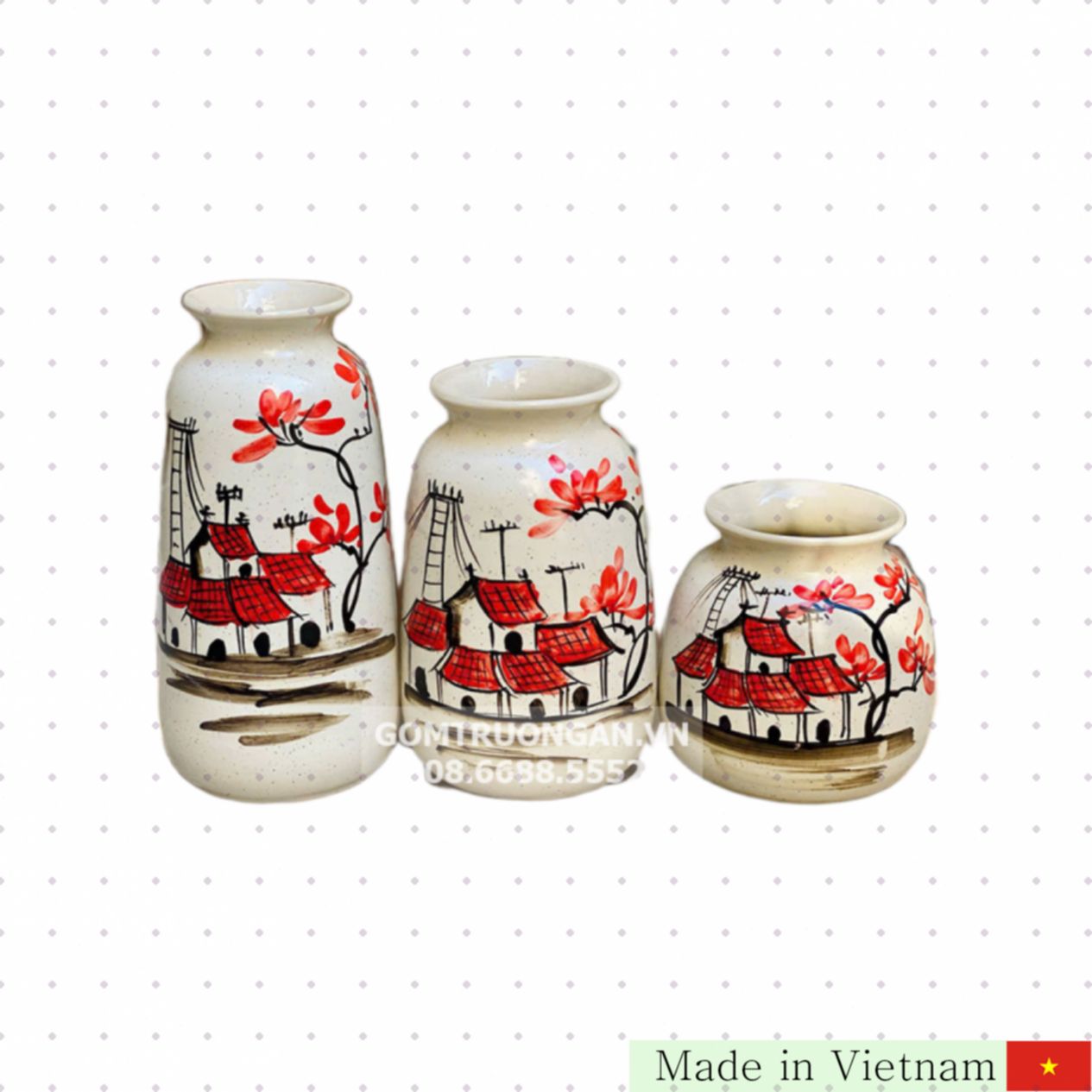 Bát Tràng의 정성으로 완성된 세트 3개 구성의 손그림 3D 꽃병 세트를 소개합니다. 고풍스러운 옛 거리 풍경이 생생하게 표현되어 공간에 품격과 따뜻한 분위기를 더합니다. 각기 다른 크기의 꽃병들은 조화로운 배치로 집안 인테리어나 사무 공간을 한층 아름답게 꾸며줍니다.🌸
