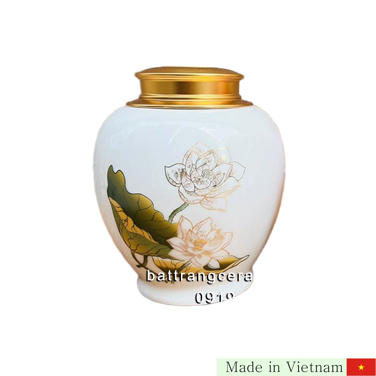 제품은 베트남 바트짱(Bát Tràng) 장인의 섬세한 수공예로 탄생했으며, 차체에는 우아한 연꽃 문양이 정교하게 그려져 있습니다. 차 보관 용기의 품질은 최고급 도자기 재질로 견고하면서도 고급스러운 느낌을 줍니다.