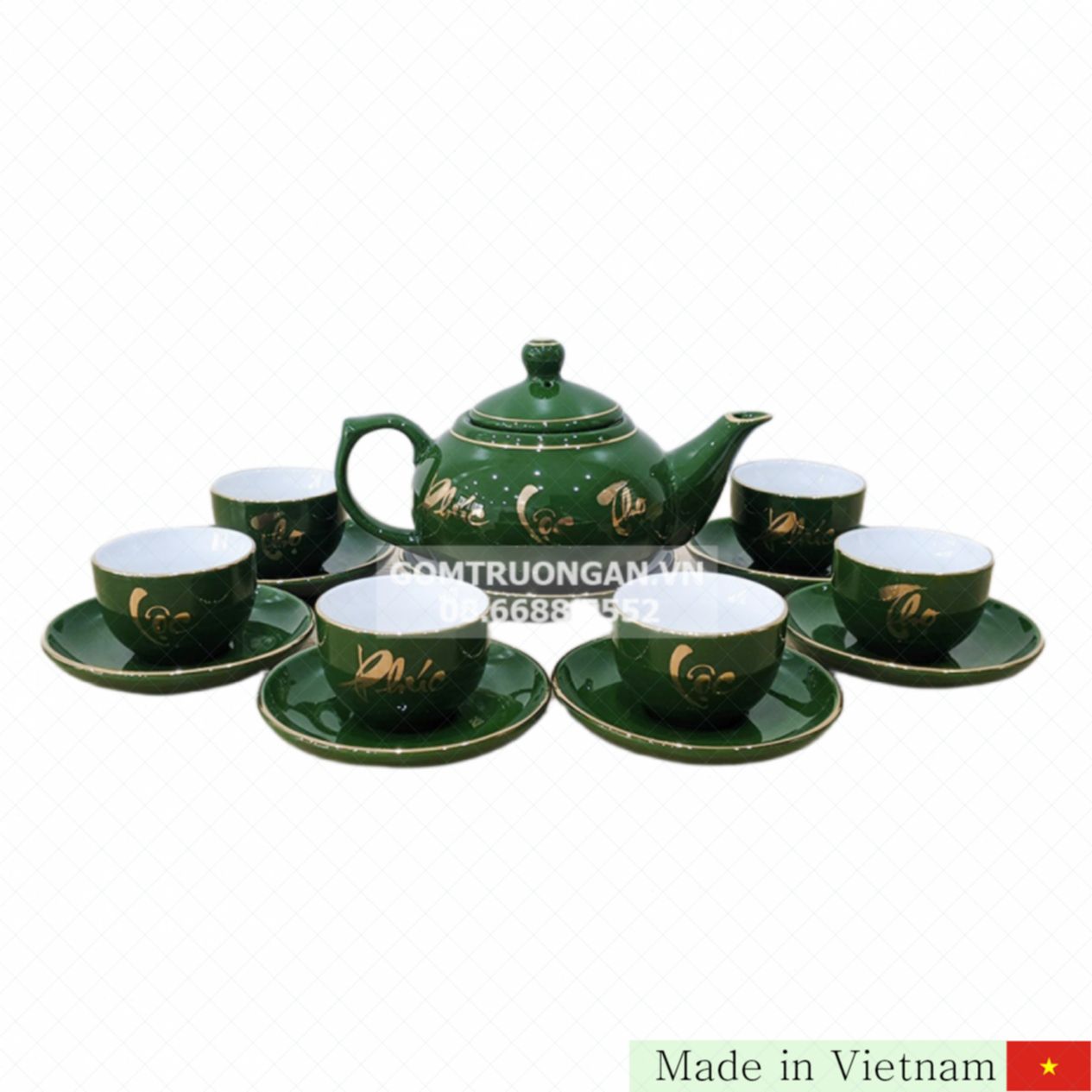 매끄럽고 반짝이는 비취색 유약이 다관과 찻잔 전체를 감싸며, 어디서나 눈길을 사로잡는 빛을 발합니다. 금박으로 정성스럽게 그려진 복록수 문양은 전통 서예의 아름다움을 현대적으로 재해석하여 고급스러움과 행운을 동시에 선사합니다. 각 아이템의 가장자리는 섬세한 금선으로 마감되어 더욱 세련된 느낌을 줍니다.