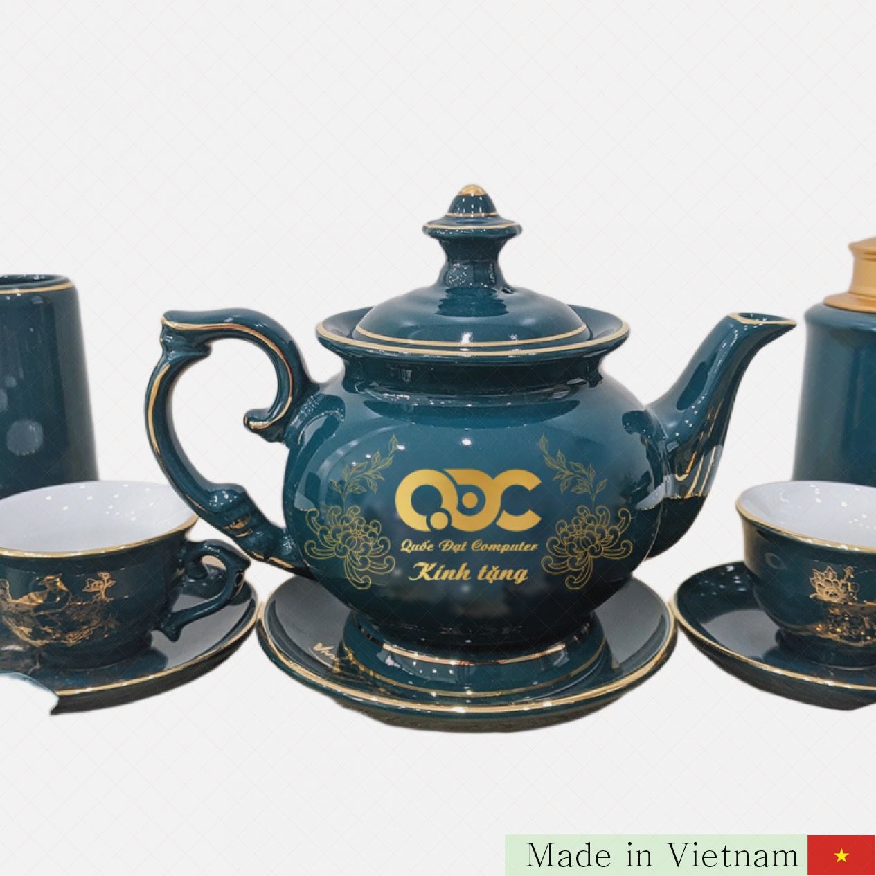 고풍스러운 청록색 비취 빛깔의 도자기 찻잔 세트, Vinh hoa Phú Quý 로고가 새겨진 특별한 디자인을 자랑합니다. 세련된 도자기로 완성되어 우아함과 전통의 아름다움을 동시에 느낄 수 있는 제품입니다. 💫