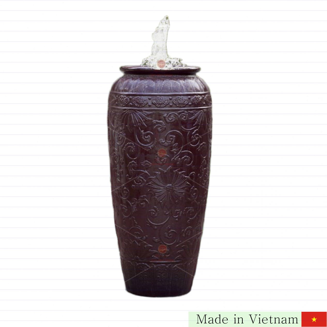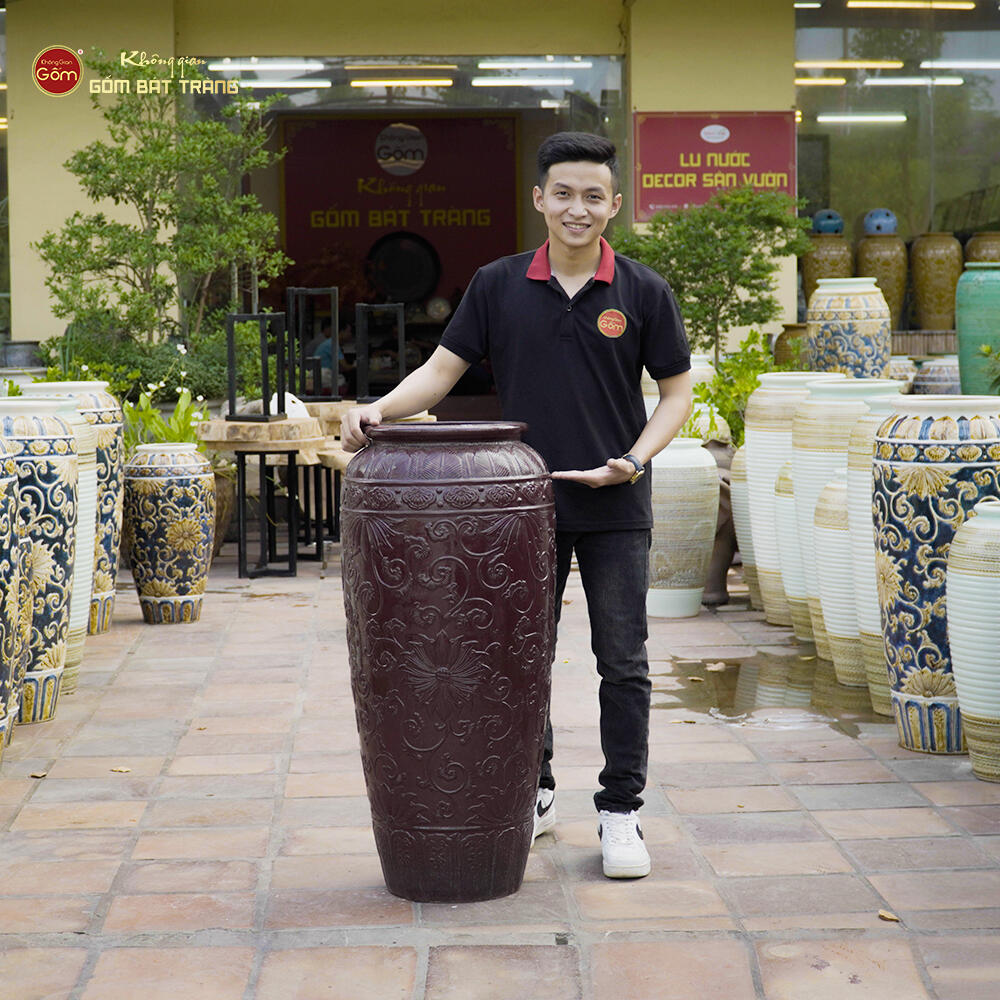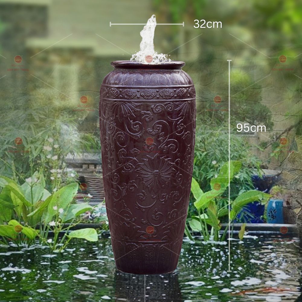 이 풍수 루워터는 고급 바트짱 도자기로 정성스럽게 제작된 제품입니다. 높이 95cm, 입구 32cm로 크기와 형태가 완벽해 실내외 어디든 조화롭게 어울립니다. 자주색 유약과 섬세한 꽃무늬가 돋보여 공간에 특별한 포인트를 더합니다.