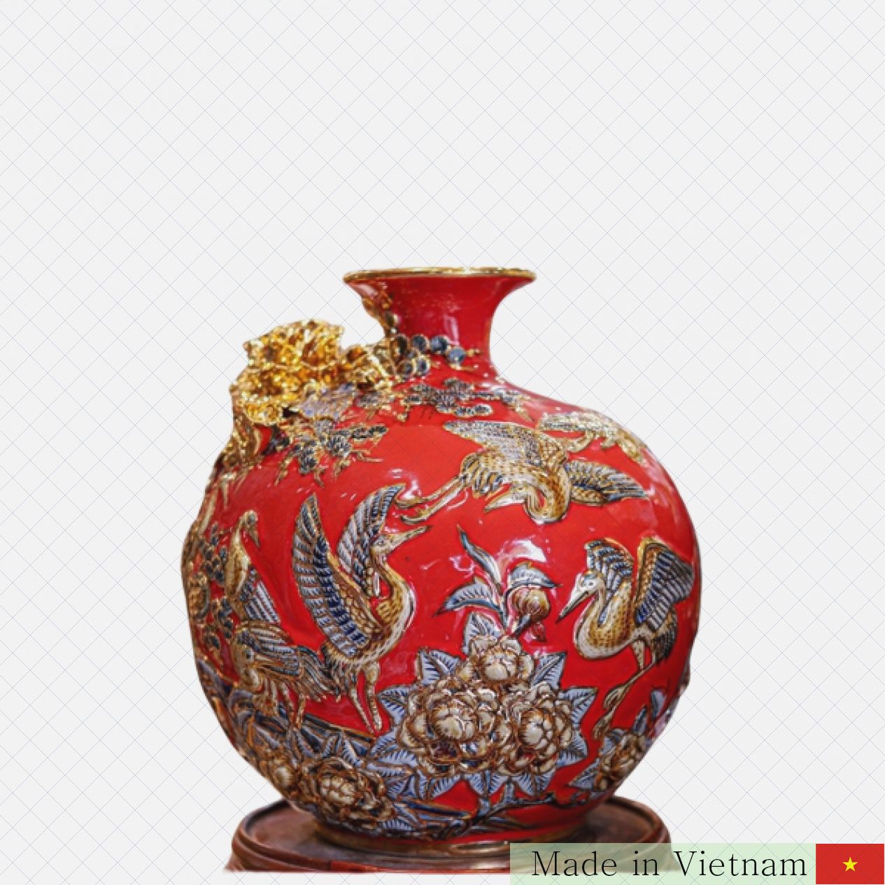 복록원명의 금송학 복록 병은 베트남 바트짱의 명품 도자기로, 강렬한 붉은 색 유약과 황금 무늬가 조화를 이루어 고급스러움과 우아함을 자아냅니다. 이 특별한 도자기는 집안에 풍요와 장수를 기원하는 의미를 담아, 공간에 생명력을 불어넣고 행운을 불러옵니다.