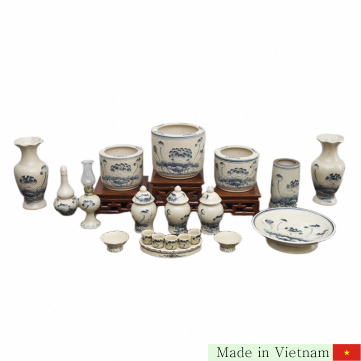 주요 구성: 3개의 분향기(지름 20cm 1개, 16cm 2개), 1개의 삼단 목선반, 2개의 화병(높이 30cm), 1개의 유등, 1개의 향통(높이 20cm), 1개의 술병(0.5L), 1개의 쟁반(지름 32cm), 2개의 촛대, 1개의 오잔컵 세트, 3개의 도자기 재떨이(0.35L).