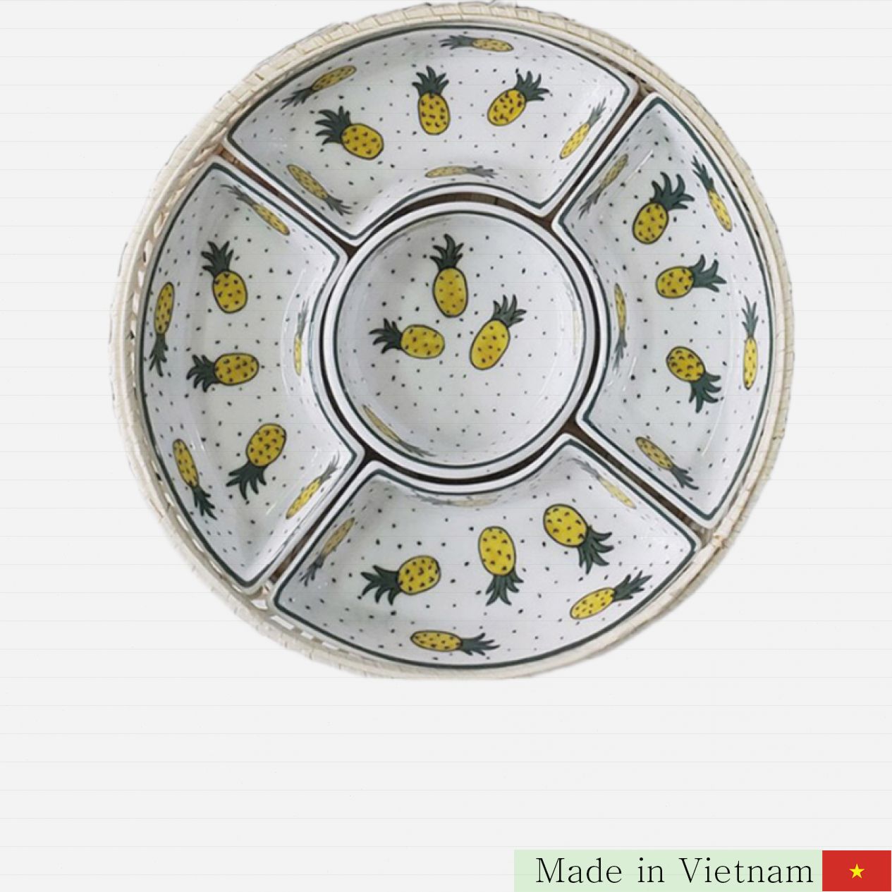 5칸으로 나누어진 도자기 트레이와 내츄럴한 대나무 트레이로 구성되어, 떡, 과일, 전통 과자 등 다양한 명절 음식을 아름답게 담을 수 있습니다.