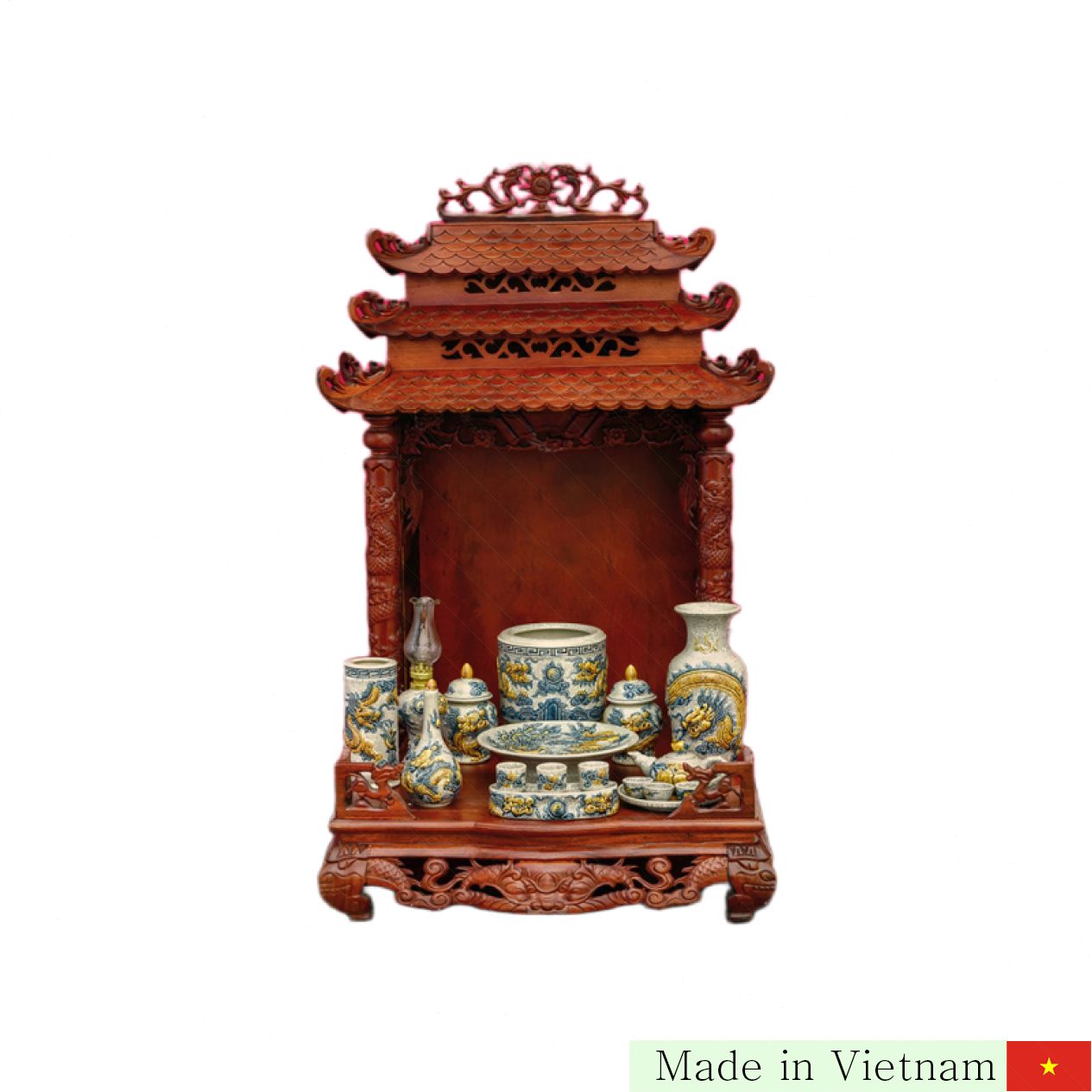 이 트ường Xuân 멘 랜 제단 세트는 베트남 전통 도자기 명소인 바트짱에서 만들어졌습니다. 정교한 핸드메이드 용 문양과 독특한 멘 랜 유약 덕분에 어떤 신단에도 고급스러운 분위기를 더해줍니다. 각각의 작품은 1000도 이상의 고온에서 구워져 견고하며 오랜 시간 색이 변하지 않아 소중한 제사를 더욱 빛나게 합니다.