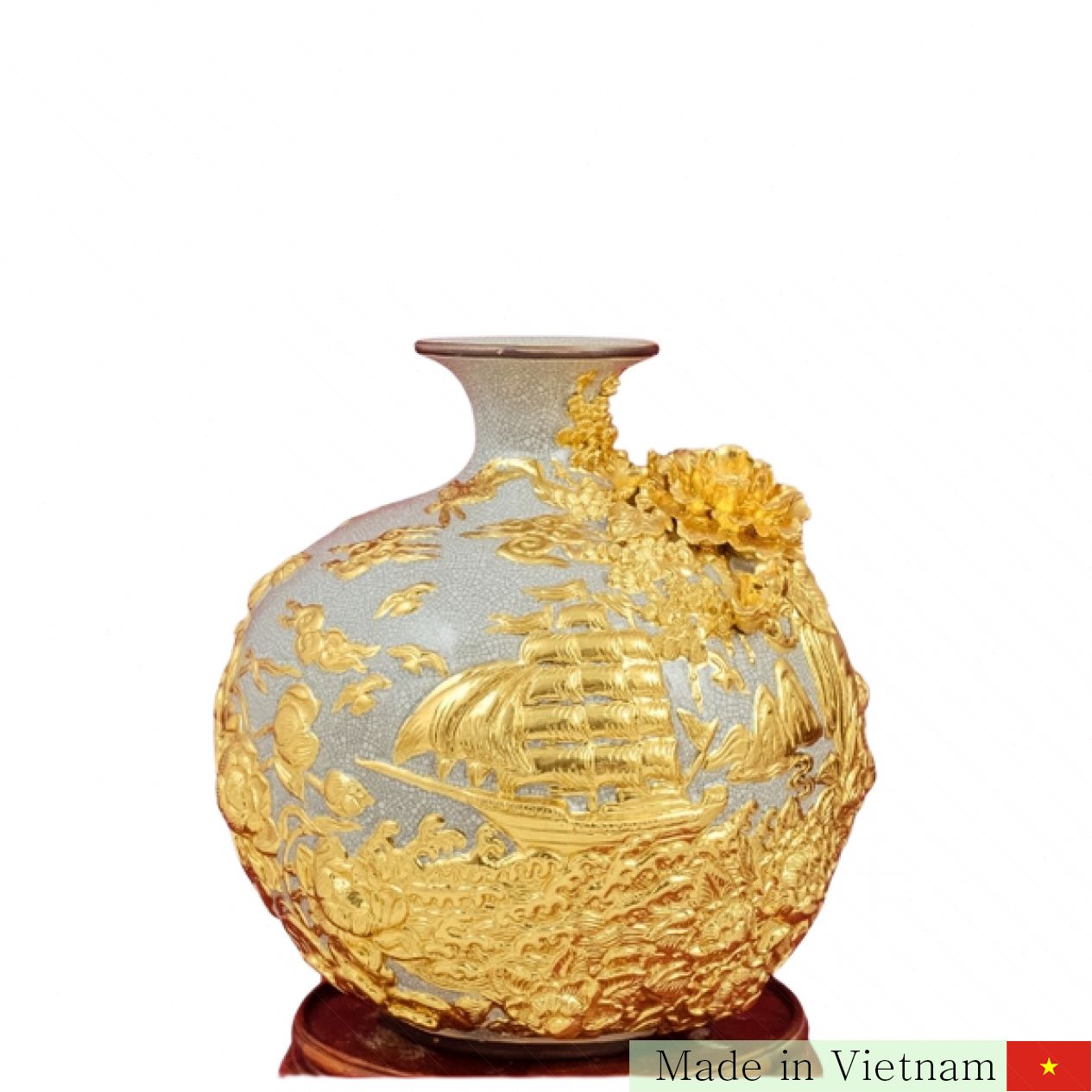 정성스럽게 빚어진 바트짱(Bát Tràng) 고급 도자기, ‘복록 원명(Bình Hút Lộc Thuận Buồm Xuôi Gió Men Rạn Dát Vàng Gốm Sứ Bát Tràng - Phúc Lộc Viên Minh)’을 소개합니다. 이 작품은 고전적인 금이 간 유약(멍 란)과 정교하게 금박으로 장식된 디자인이 조화를 이루어, 삶에 행운과 번영을 가져다주는 품격 높은 풍수 제품입니다.