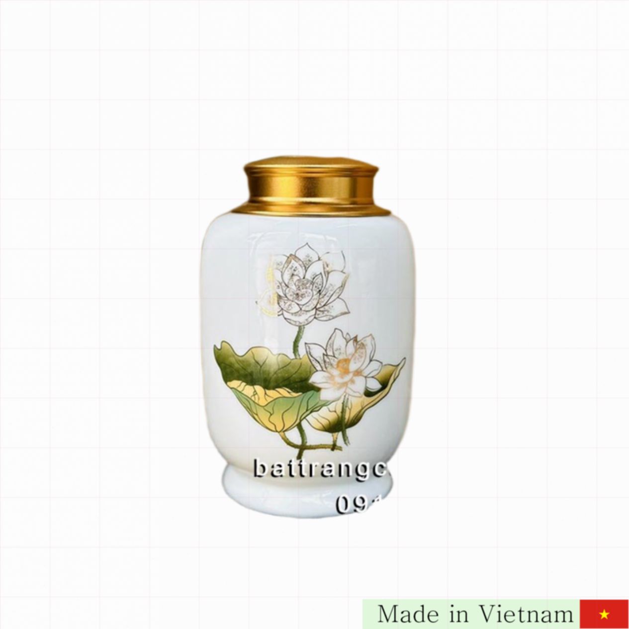 세밀한 장인 정신이 깃든 바트짱(Bát Tràng) 도자기로 만들어져, 차 보관병의 몸체에는 정교한 연꽃 무늬가 섬세하게 그려져 있어 고급스러운 느낌을 줍니다. 차 향이 오래도록 유지될 수 있도록 설계된 두 겹의 동금속 뚜껑은 공기 차단에 탁월하며, 직접적인 빛을 차단하여 차의 신선함과 풍미를 지켜 줍니다. 이 모든 디테일이 결합되어 차를 마시는 순간마다 깊은 만족감을 선사합니다.