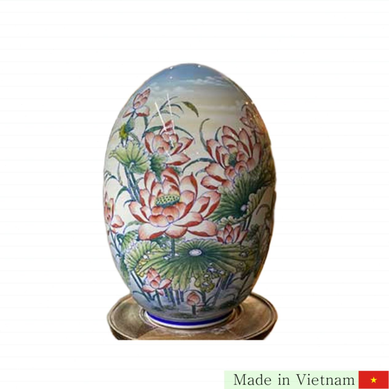 트렌디한 디자인과 정교한 수공예의 만남✨ 트로피컬한 연꽃 무늬가 돋보이는 45cm 높은 고급 도자기 계란입니다. 이 제품은 전통적이면서도 세련된 바트쯔랑(Bát Tràng)의 명품 라인으로, 집안 인테리어에 품격을 더해줍니다.