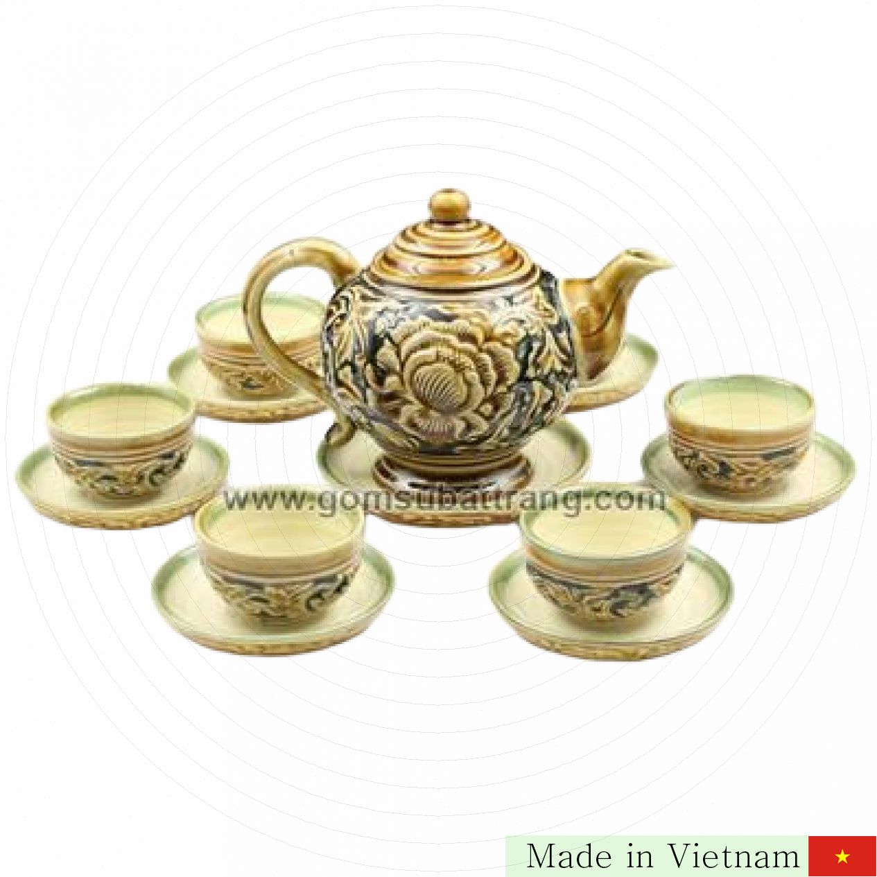 [Bộ ấm chén quả hồng khắc nổi hoa phù dung men vàng]은 고급스러운 디자인과 뛰어난 품질로 집안 분위기를 한층 더 우아하게 만들어 줍니다. 섬세하게 조각된 복숭아 모양에 채색된 금빛 유약의 조화가 눈길을 사로잡습니다. 특별한 날이나 소중한 손님을 위한 최고의 선택입니다.