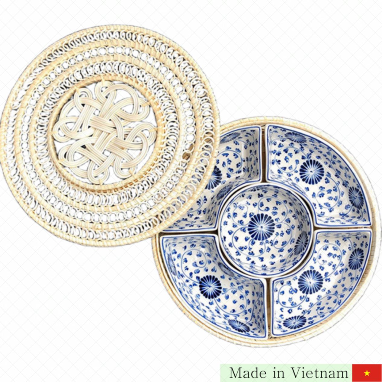 구성: 4개 쟁반 + 1개 원형 도자기 용기 + 대나무 받침 & 뚜껑