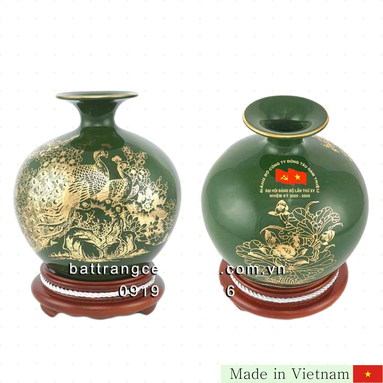 우리의 고급 행운병은 명품 바트짱(Bát Tràng) 도자기로 제작되어 뛰어난 내구성을 자랑합니다. 24K 금박으로 정교하게 장식된 초록색 광택은 기업 로고와 정보를 돋보이게 하며, 고급스러운 포장 박스와 함께 제공되어 행사 분위기를 한층 높여줍니다. 수작업으로 정성껏 유약 처리 및 금박 도장한 제품은 세밀한 디테일이 살아있어 특별한 선물로 완벽합니다.